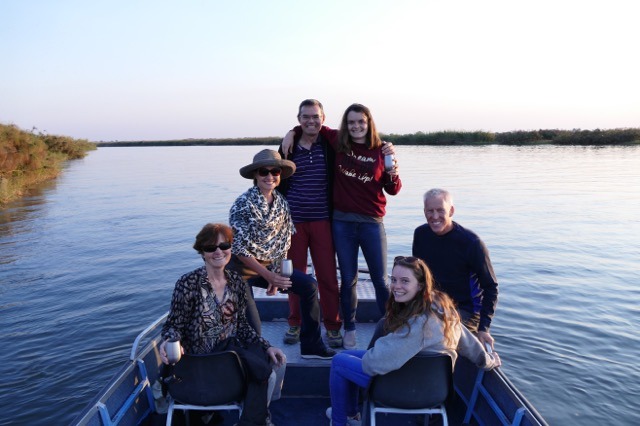 Woke up at 6am and enjoyed coffee on the river watching the sunrise. Then it was packing up and heading for Botswana. We had about a 5-hour drive from Runda across the border between Namibia and Botswana. Had lots of advice on how to handle the border crossing and all the challenges of fresh food etc. It was a synch and they charged us less than US$25 per car!!! Never even looked in our fridge… Arrived at Drotsky’s Cabin camp site – another great setting along the river. Only problem is monkeys, a lot of then so had to close up everything to avoid finding our tent or car turned upside down. We decided on a sunset cruise after setting up camp. The sunset cruise was more than we could imagine – not only did we enjoy bubbly and Windhoek watching the sunset, we saw a plethora of bird life, crocodiles, a leguan (monitor lizard) and a hippo. Not bad in one hour. Given the border challenges we had opted for dinner at the lodge and enjoyed a scrumptious meal accompanied by a bottle of Zonnebloem Merlot.