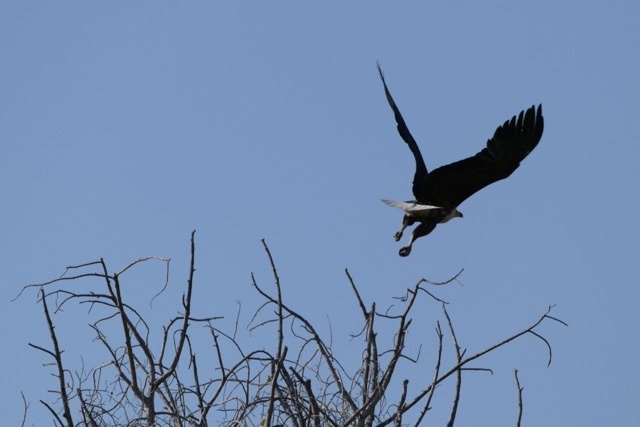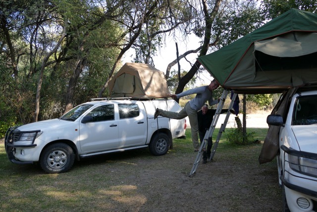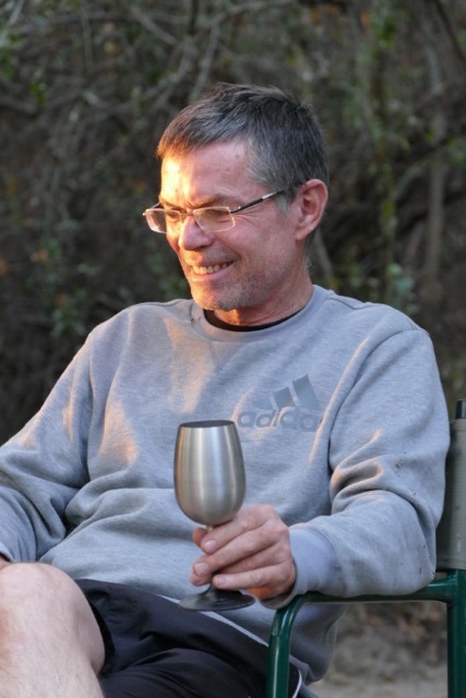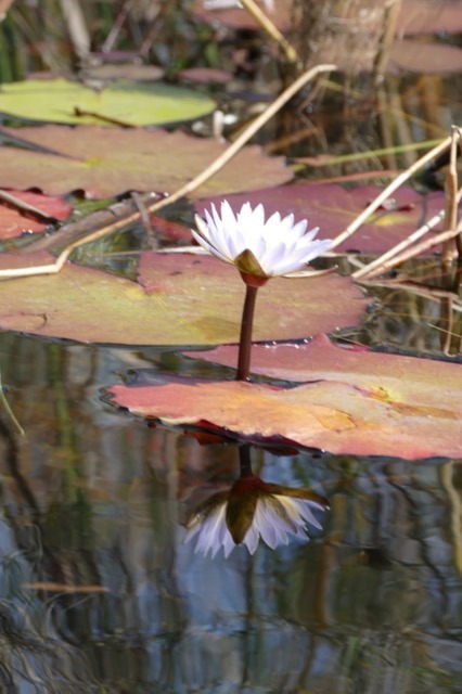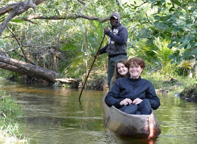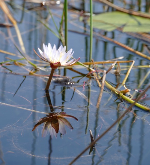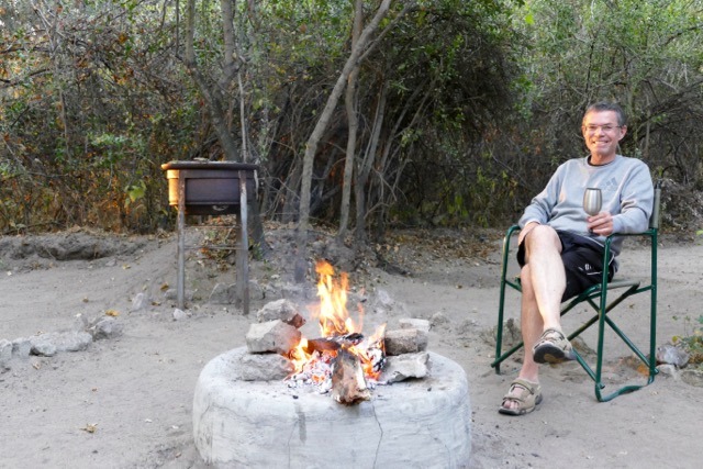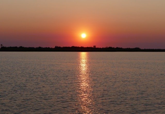 Coffee on the deck watching the sunrise over Guma Lagoon is how we started the day. What a magnificent sight. At 8am we headed out by speedboat with our Mokoro “drivers” across the lagoon to Mokoro Island. There we picked up our Mokoro’s and headed out for a tour of the delta. The Mokoro is a traditional boat used in the delta, in the past it was a dug out log and today is made our of fibre glass, seats two and is propelled by a boats man who stands in the boat and propels it with a long pole similar to a gondolier. Sitting inches off the water we glided quietly through water channels surrounded by tall common reeds, bulrushes and papyrus. The water around us was covered with water lilies and their pads. The water was crystal clear and you could see the root system of the lilies. Bird life was abundant, loved seeing a pair of fish eagles take flight, and there were crocs though fairly small, am waiting to see the 5 metre croc… What was interesting about our journey is the contrast in vegetation. Some channels we went through had thick grass and it looked like we were floating through a meadow. We stopped at one of the islands for a nature walk and a picnic lunch. Headed back around midday gliding through the channels to Mokoro Island for our return journey to our campsite. I whiled away the afternoon reading a Deon Meyer novel. At 4pm, Michaela, Melissa and Dan did their helicopter ride. Given this is a sightseeing heli ride the doors were removed for better viewing and photography. It was exhilarating and they came back with stories of elephant and hippo sightings and are ready for their next heli ride!!! Glenn and I decided to take our showers while they were out and unfortunately the shower had deteriorated, it ran out of water – fortunately I managed a bit of a shower dancing around avoiding the scalding and freezing water, however Glenn had to pass on his shower and find some bottled water to completed his shaving as the water ran out midway. I guess the campsite was full and the tanks empty, took about two hours before the water tanks were full and the water back in our campsite. Dinner was divine though we did almost loose our steaks. They were sitting out ready – salted and peppered by Melissa and resting. An African wood owl spotted them and settled in the tree watching for an opportunity to pounce. It was great observing him, once he realized he was out of luck he left. We sat down to sirloin steaks, “pap” and chakalaka sauce, steamed baby carrots and a greek salad with some lovely Terra Del Capo 2010 Sangiovese. Everyone played a role in the dinner prep and it was scrumptious, there were no leftovers. We finished off the evening back at the bar for a whisky and some more local story telling.