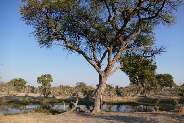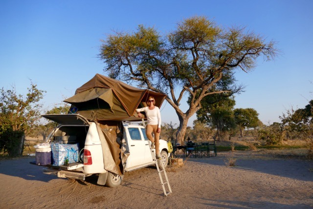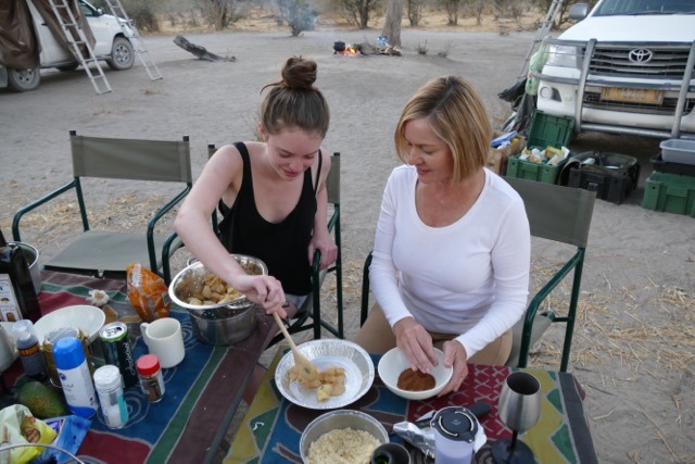 After a hot shower and charging all our devices in anticipation of no electricity, we headed to breakfast. There we reviewed the plan for the day and our drive through Moremi Game Reserve. Exciting times ahead. We headed off with all our supplies and ready for 6 nights of camping. We had been receiving conflicting advice about the road conditions and very soon learnt the truth. I was driving the first leg and had my first really challenging driving. The tar road ended quickly and I was faced with dirt road that alternated between washboard, severe potholes and sandy stretches, some very deep. I am pleased to say I managed, Andy of course was loving it, this is exactly what he wanted and allowed him to test low range! We entered Moremi at south gate and exited at north gate. The roads just got worse and worse, potholes were awful. The game sightings were just okay – saw impala, zebra, African ground hornbill, lots of birds and a giraffe but not much else. However, when we exited the park we headed across a rickety bridge and noticed a large pod of hippos. Spent some time watching them and then headed on to Dijara where we saw an abundance of wildlife – giraffe and elephant sightings were the best. We arrived at the campsite and went to reception – a small sign with a scull at its base and a viewing deck. We met the camp manager Andre, a South African hunter who is now giving back. Living in a tent, managing this campsite in partnership with the river bushman. The campsite is named after the bushman and Afrikaans word and means “many years”. This was a spectacular place, totally unspoilt with each campsite having its own ablution facilities. They were basic, a canvass structure open to the sky with a toilet and a bucket shower. It has a pulley system – you fill the bucket in the morning and the sun warms the water. It has a showerhead and works pretty well but best to take a shower when it is still warm outside as it is quite fresh. Our campsite was on the banks of the river kwai and no fences. Dinner was a braai as we had a long day or travel and still needed to set up camp. This was also the night for apple crumble and custard made by Melissa and I – was a lot of fun and it was devoured by all. We ate near the river and the hippos were a little bit active so we retreated to the fire after dinner. That evening we were woken by hippo sounds, elephants and a pack of hyena who actually came into our campsite and paid us a visit. We all stayed in bed and just experienced this from the safety of our tent!