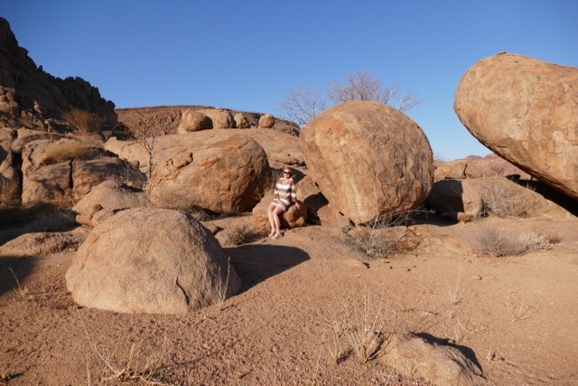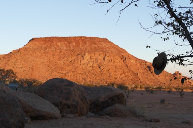 A 6am wake up call by our iPhone and the Franklin’s, Andy had the kettle on and it was not long before we were sipping a lovely instant coffee and watching the sunrise from our camp site. Mornings are so peaceful in the bush. Was not long (all relative lots to pack up each day and fit in a 4×4) before we were packed and heading to our first activity for the day – the walk to the White Lady. The White Lady is a bushman rock painting near the highest mountain in Namibia. We hired a guide and Andy, Michaela, Glenn and I did the walk, about 2 hour round trip. Melissa stayed back with Dana and “looked after her”, well that was her excuse! The interesting thing is the White Lady is neither White nor a Lady, probably controversy adds to its fame. Soon after that we arrived at Moweni Camp Site. A truly breath taking camp site built into the natural vegetation. Only 7 campsites, each with its own ablution facilities and kitchenette. Also we had our own “donkey” that was stoked at 4pm and 6am, abundant hot water for our showers. What more could one ask for, a perfect place to camp. This evening I was chef and Melissa my sous-chef. We served a gourmet meal of sautéed potatoes with fresh rosemary (no thyme available at SPAR), gem squash with creamed corn and ostrich fillets. Of course sundowners included bubbly and we had a lovely Springfield Work of Time to accompany our meal. After the girls went to bed we sat around the fire with a bottle of Chocolate Block and studied the stars – helps having two astronomers and Glenn’s app on hand.
