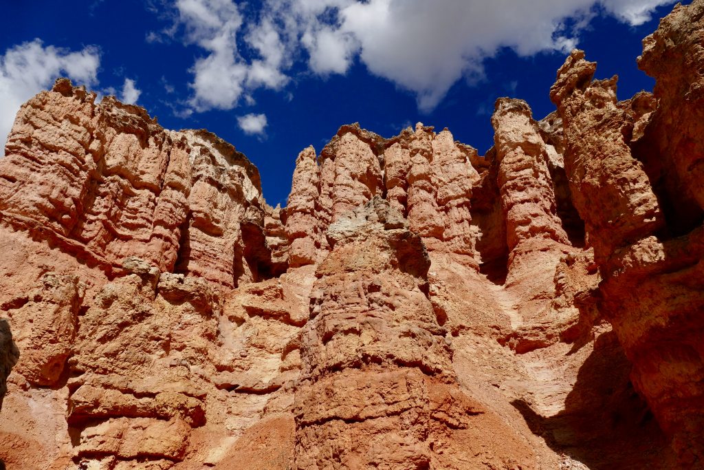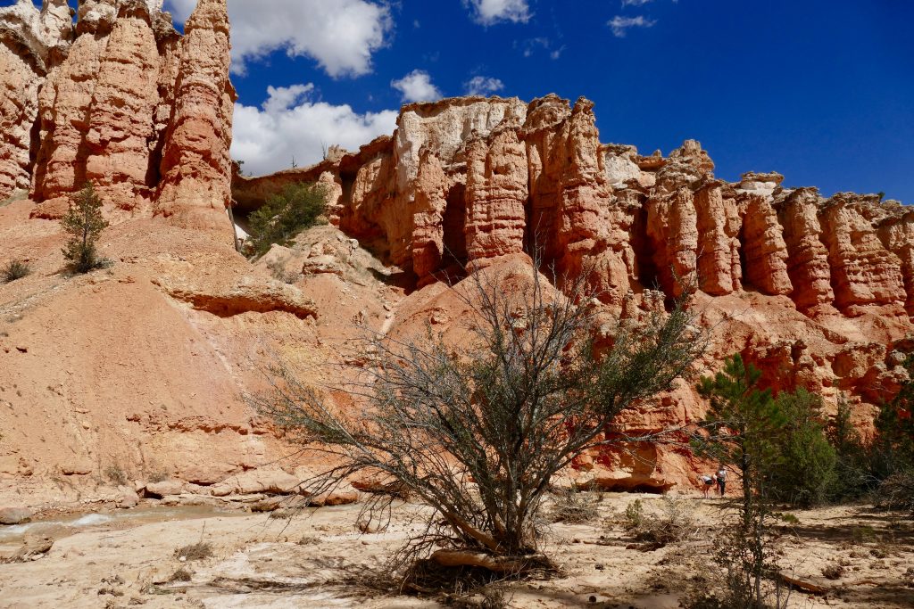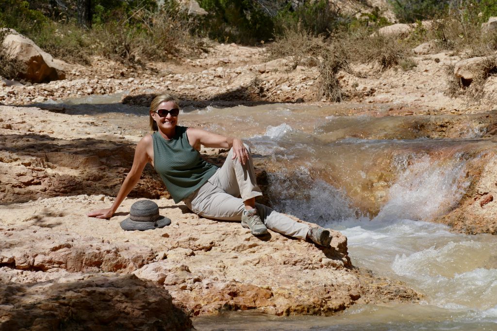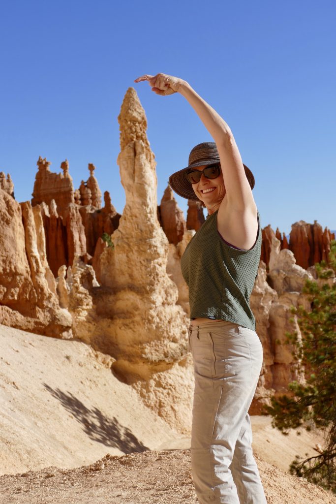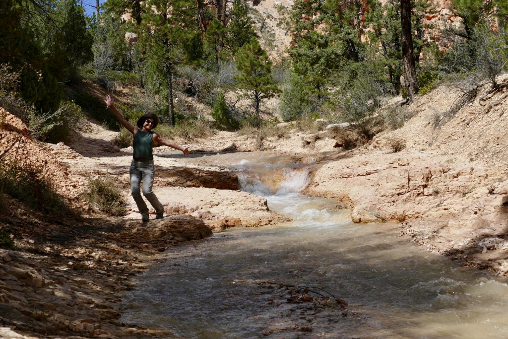 Our intention while at Bryce was another sunrise hike. We set out at 6:30am, only a 10-minute drive away we started our hike from the bottom of the canyon towards Peekaboo Trail. Unfortunately, it took a bit longer despite some jogging (much to Glenn’s dismay) to get out of the forest and to a suitable viewing point. At least we did catch the light emerging on the hoodoos – a column or pinnacle of weathered rock. An amazing sight looking across the canyon as the sun illuminated the formations. The hike was beautiful, and we enjoyed the ever-changing scenery, formations and shadows, even eerie at times. Was about an 8-mile hike. We finished in good time and headed off for a coffee before, yet another hike recommended to us – the Waterfall and Mossy Cave trail. The mossy cave was underwhelming but the waterfall trail was spectacular. Given it was lunchtime, we found a lovely shady spot by the stream to enjoy our sandwich and crisps (earned these). Glenn dropped the lid of his water bottle on the rock we were sitting on and it rolled into the stream heading down towards the waterfall. A hilarious sight watching him running along the fast-flowing stream trying to catch the lid – of course he ended up stepping in the stream!!! Lucky for him, another tourist rescued the lid. The stream flowed from the reservoir above Bryce Canyon and we were able to walk for a couple of miles along the stream and encounter beautiful rock pools, small waterfalls and rapids. Very enjoyable and different to our other hikes, did 4 or 5 miles without even realizing it.