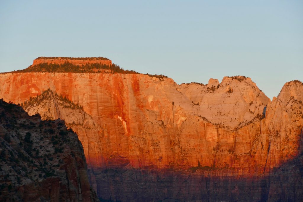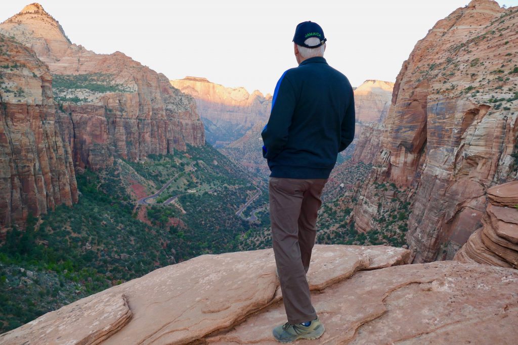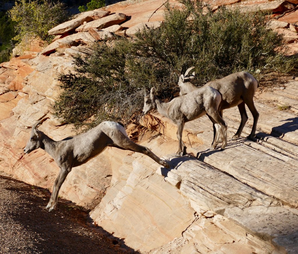 Headed out early to catch sunrise at Canyon Overlook, a 2-mile round trip hike. It took a bit longer than expected to get there and had to motor up the trail to catch sunrise. Was amazing to see the colors change and the light catch the various formations. Very enjoyable and worth the early morning. Cool animal sighting along the road – a herd of bighorn sheep.