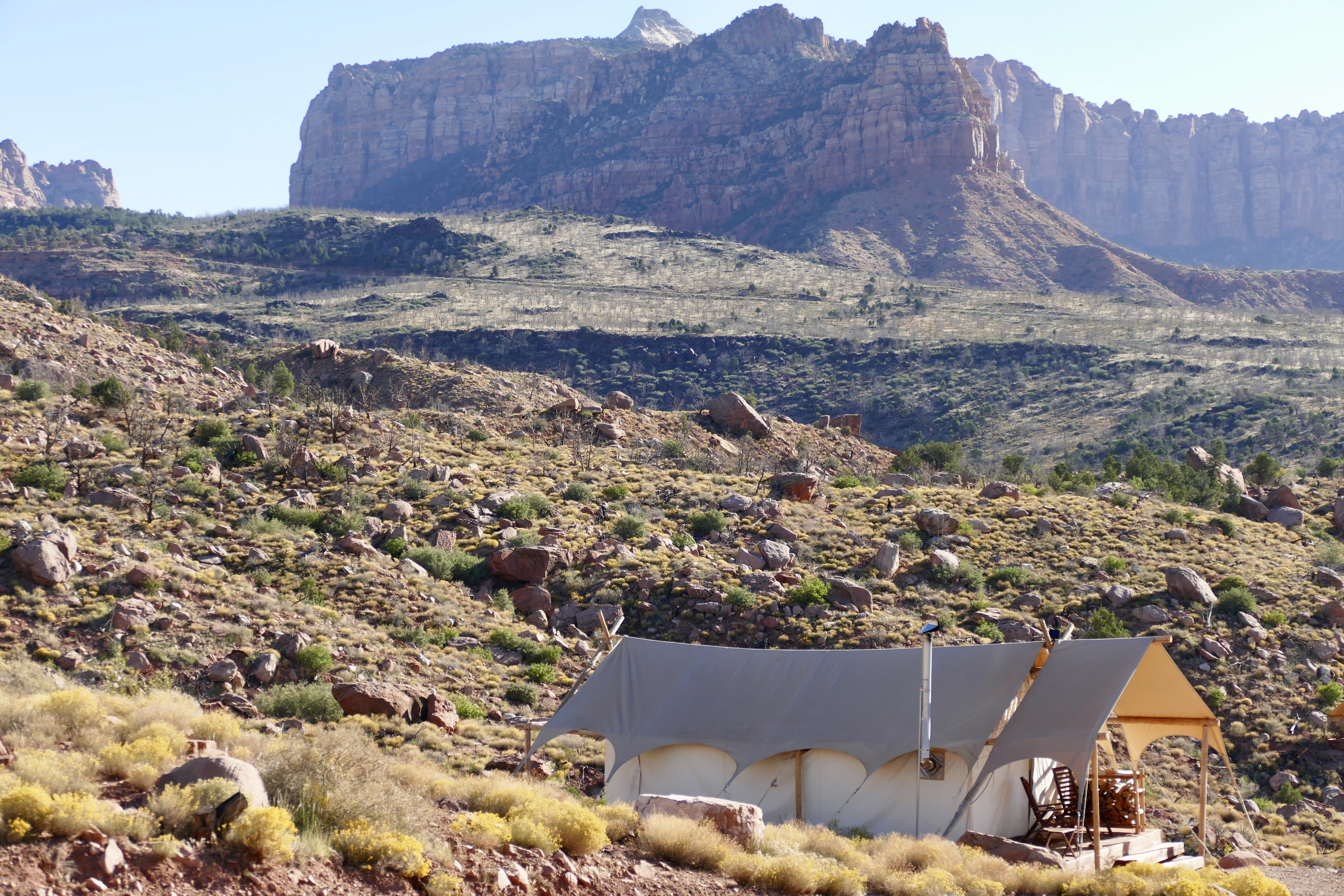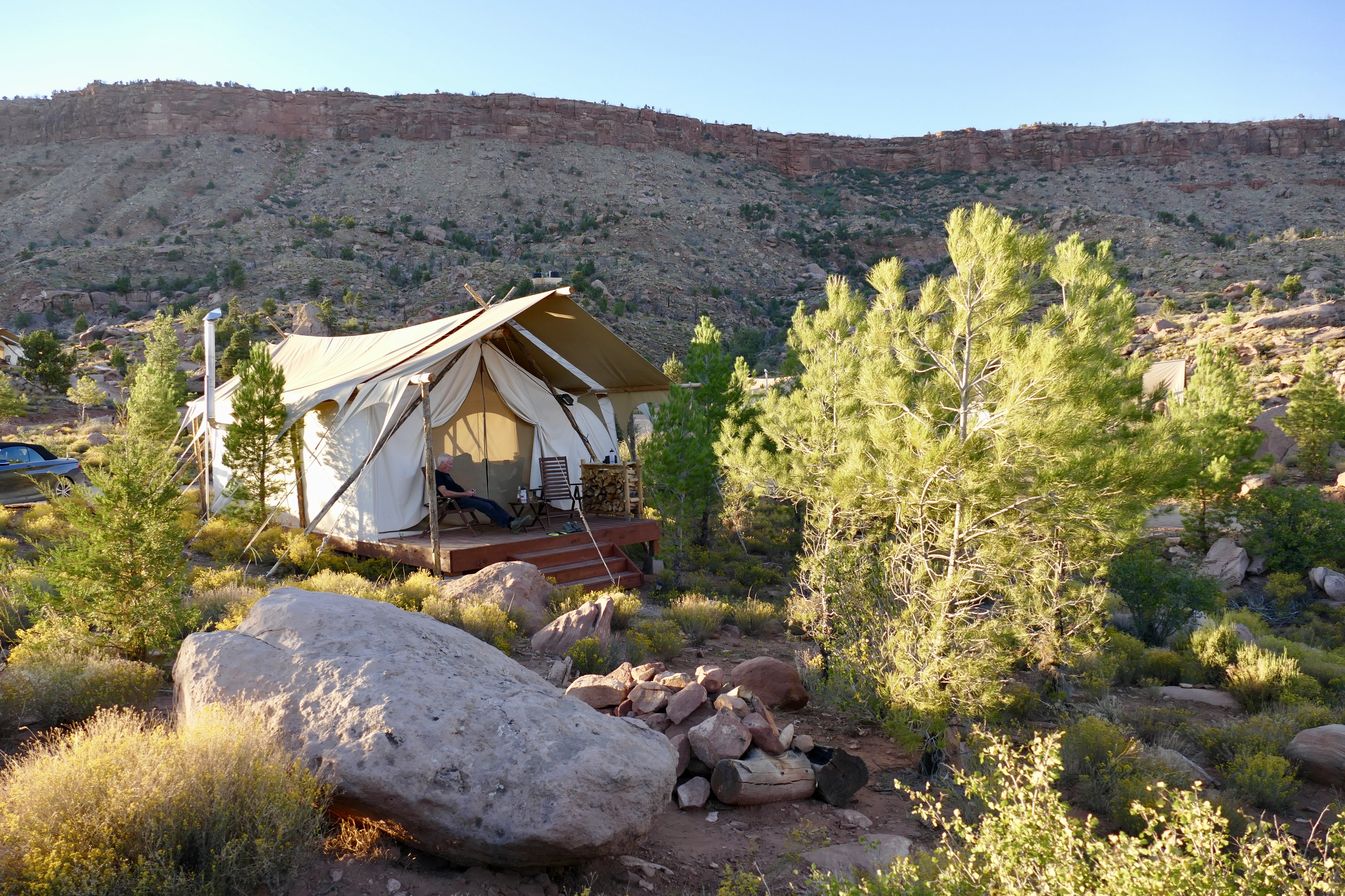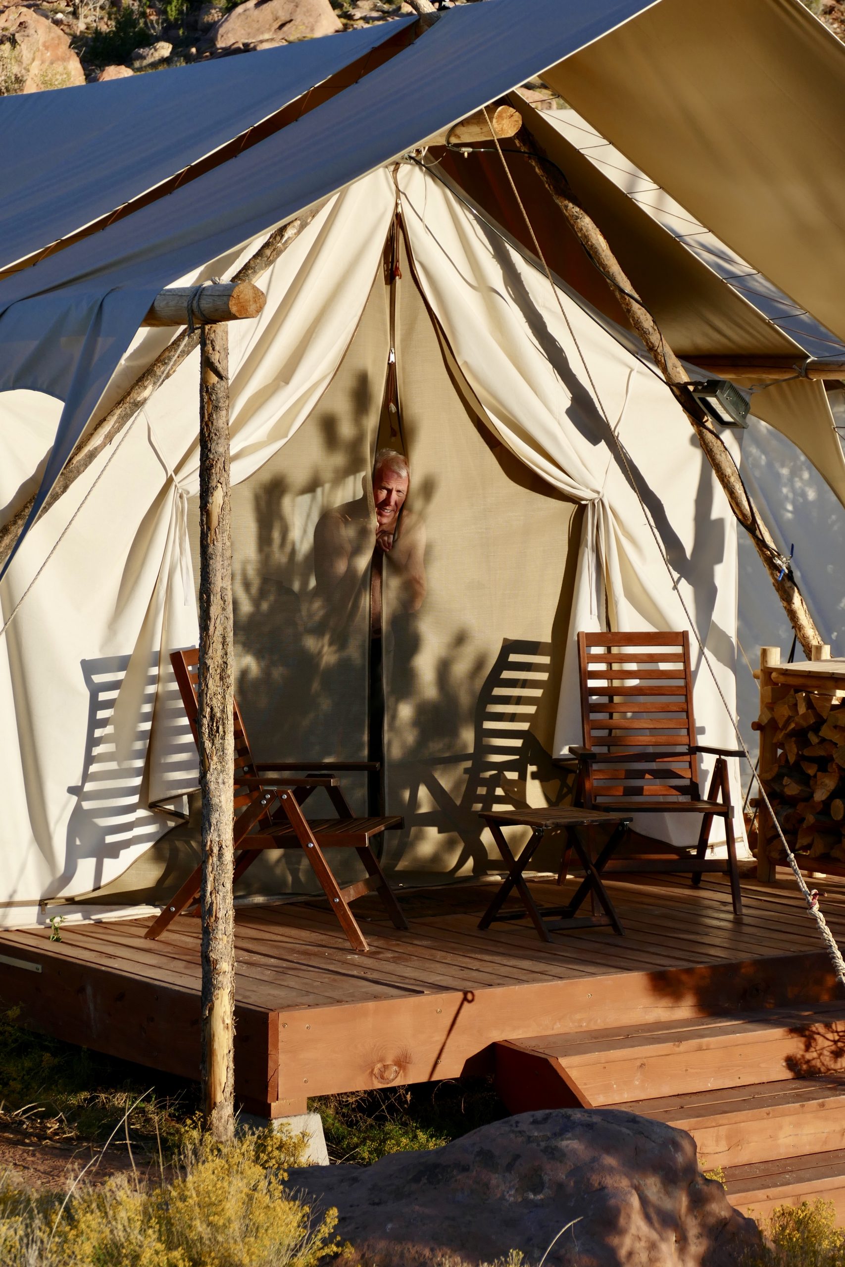 Spent 3 nights at Zion Under Canvas. What an awesome place. It is on the edge of Zion National Park and about a 30-minute drive to the visitor center. It is glamping American style. Each room is a tent with a wooden floor, small bathroom with shower, a seating area inside the tent, and a porch where you can sit and look out across the canyon and watch the stars at night. This property is completed off the grid – no WIFI, all electricity from solar with a small restaurant to serve guests and basic grilling facilities.