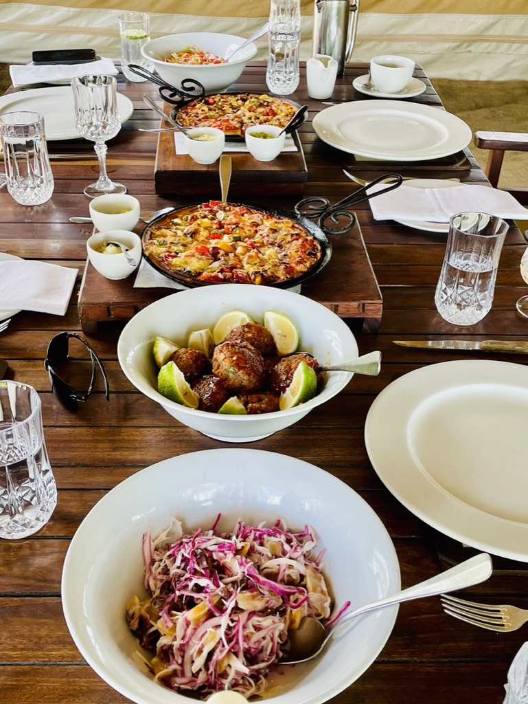 Back for a lovely lunch, family style salads, vegetarian pizza and meatballs for Wayne. Very enjoyable then time for our daily shower. You choose the time of your shower, and our butlers prepare the hot water and fill the canvas bucket. Voila shower is ready!!! Otherwise called a “bucket shower in the bush”.