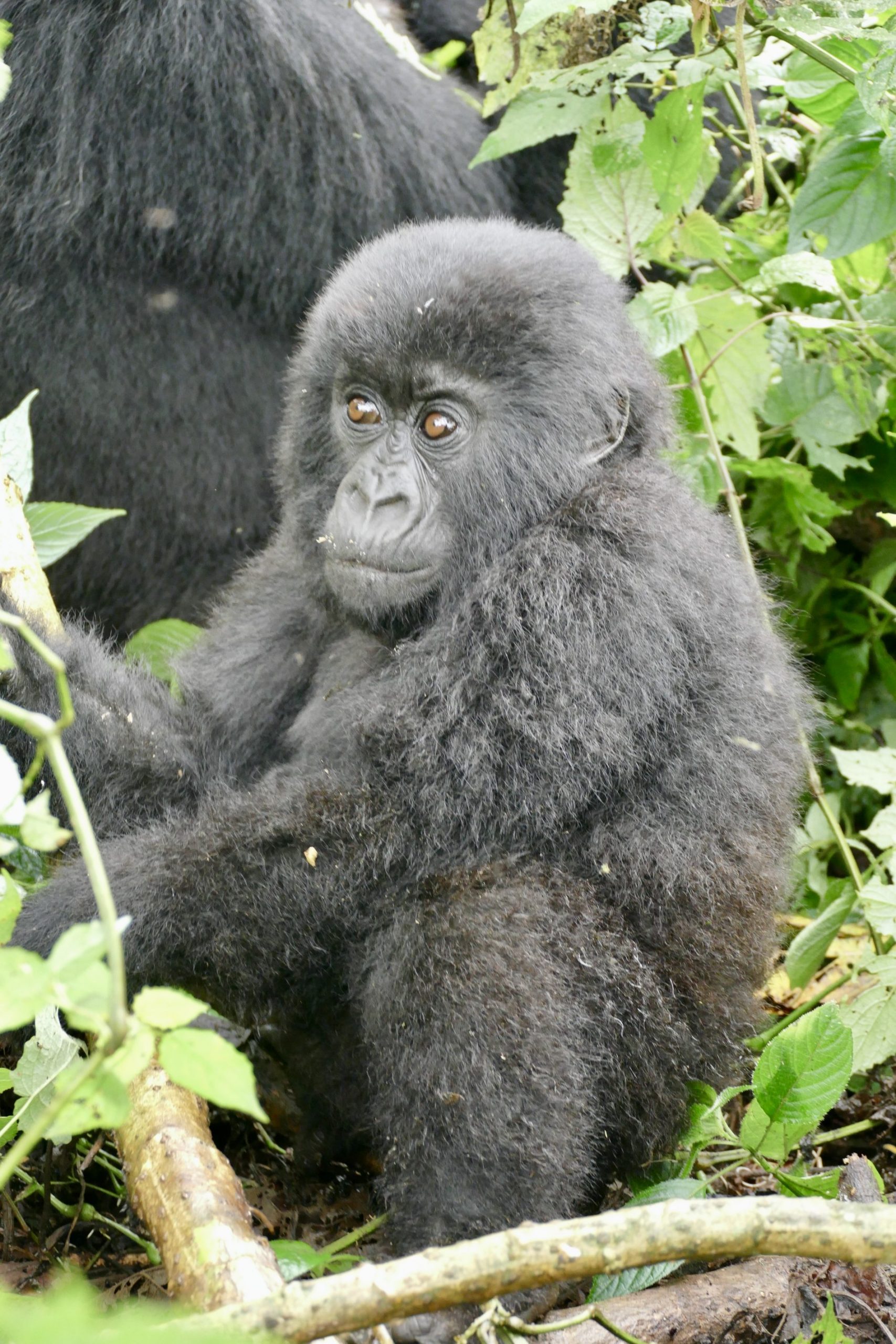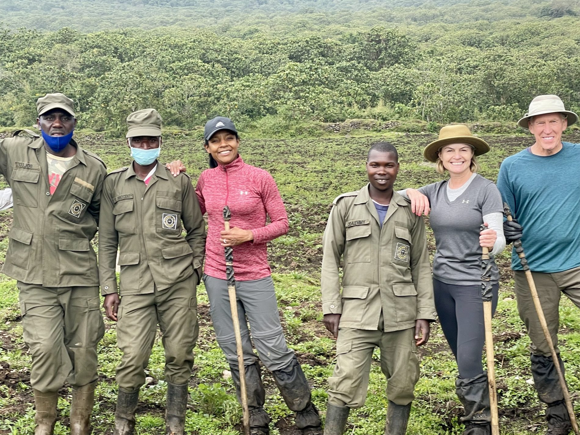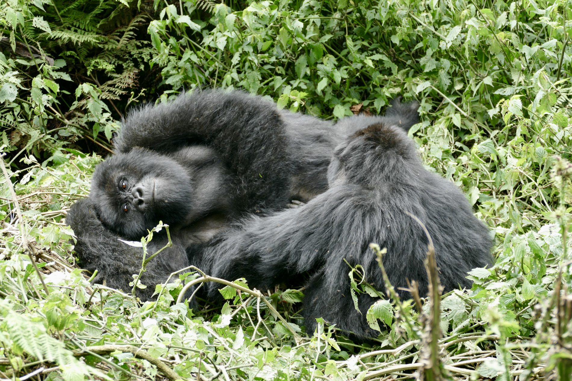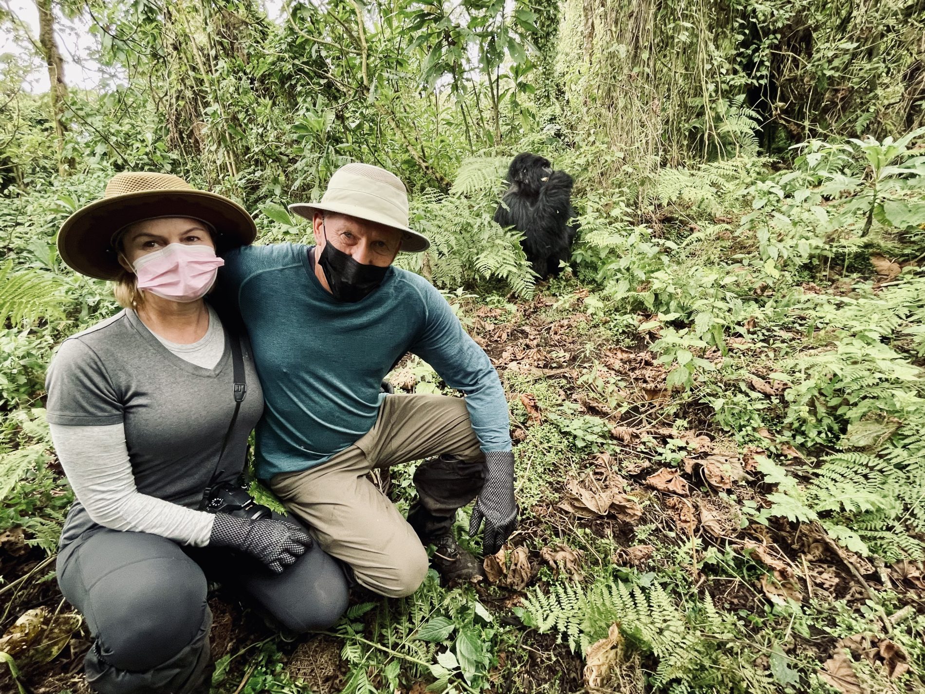 The hike was about 5km’s round trip through dense tropical jungle with only 70% on a trail and 30 hacked through brush with machetes. It took about 90 minutes to get to the gorillas. As soon as we neared them all protocols set in. Masks on, no bags and poles, that all remained behind with the porters who stayed back and waited for our return. Our guide and two trekkers took us in to meet the Kwitonda troop. Within 5 minutes we spotted the first gorilla and then spent 1 hour watch and following them. Exhilarating to see them interact, play, graze, groom and move from place to place. Finally, we got a silverback porn show. The chief silverback mated in front of us with one of the females, and at some point, one of the babies came to see what was going on.  During our encounter we kept our distance as best we could, but you do get close as they dash past or between us. The silverback you could touch when he walked past us and Wayne almost felt him as he moved – he was enormous. One of the babies ran past Simonne and touched her. Just before we left an adolescent gorilla ran between Glenn and a trekker who was 3 feet away from each other and grabbed Glenn’s leg on the way past – mistook it for a tree!!! Fortunately, Glenn was standing next to a tree as it almost knocked him over – he fell back into the tree and trekker put out a hand to stabilized Glenn.