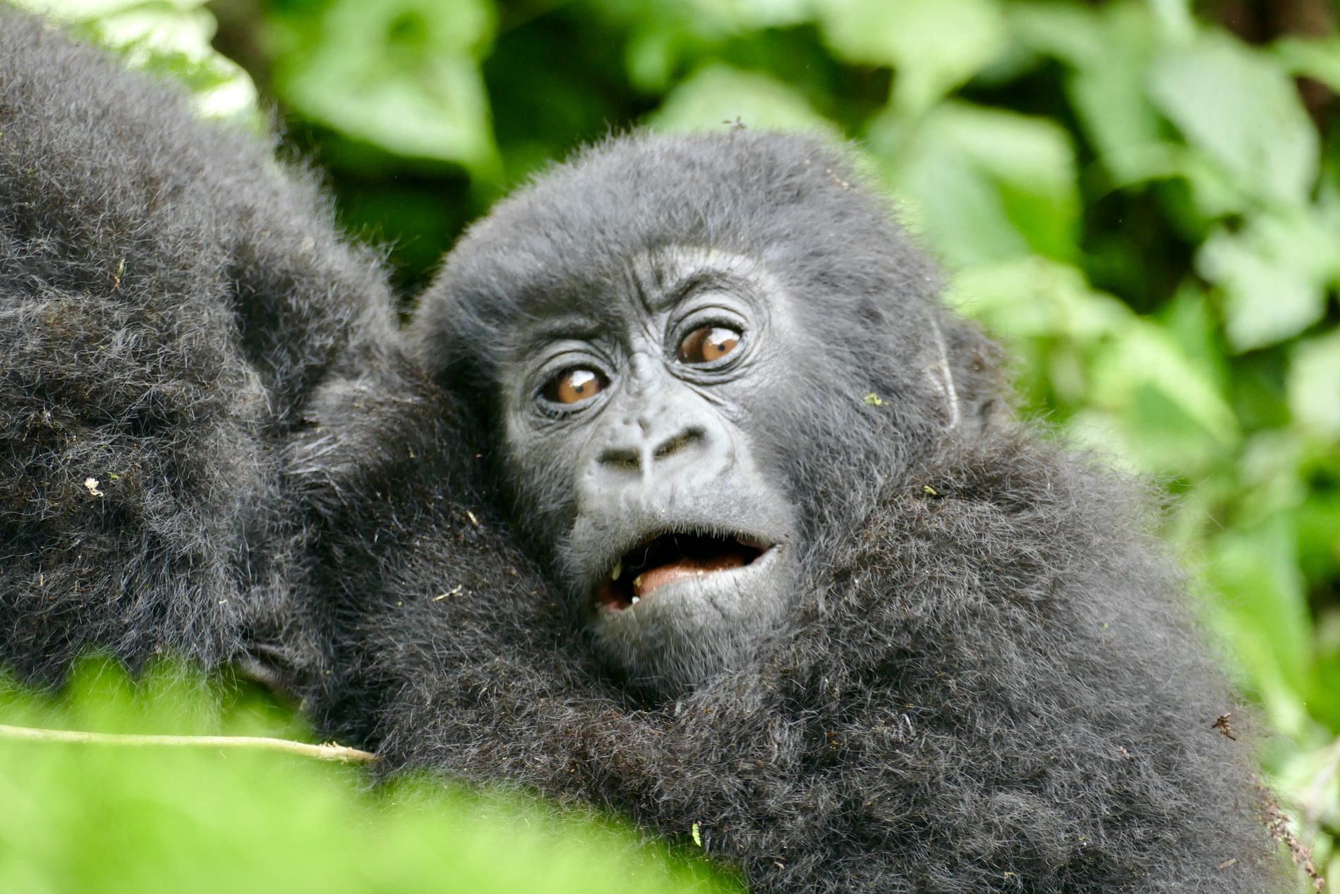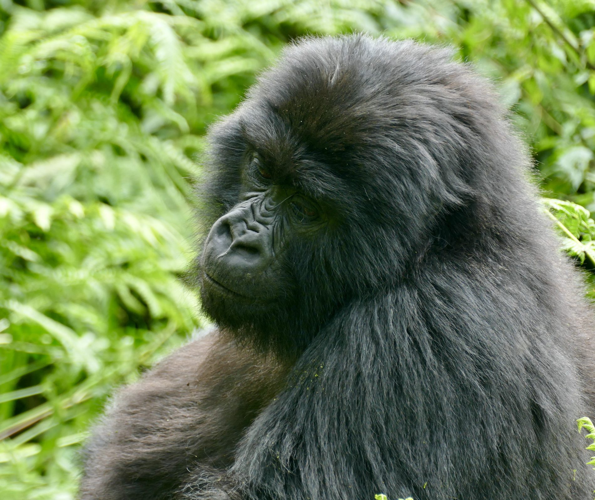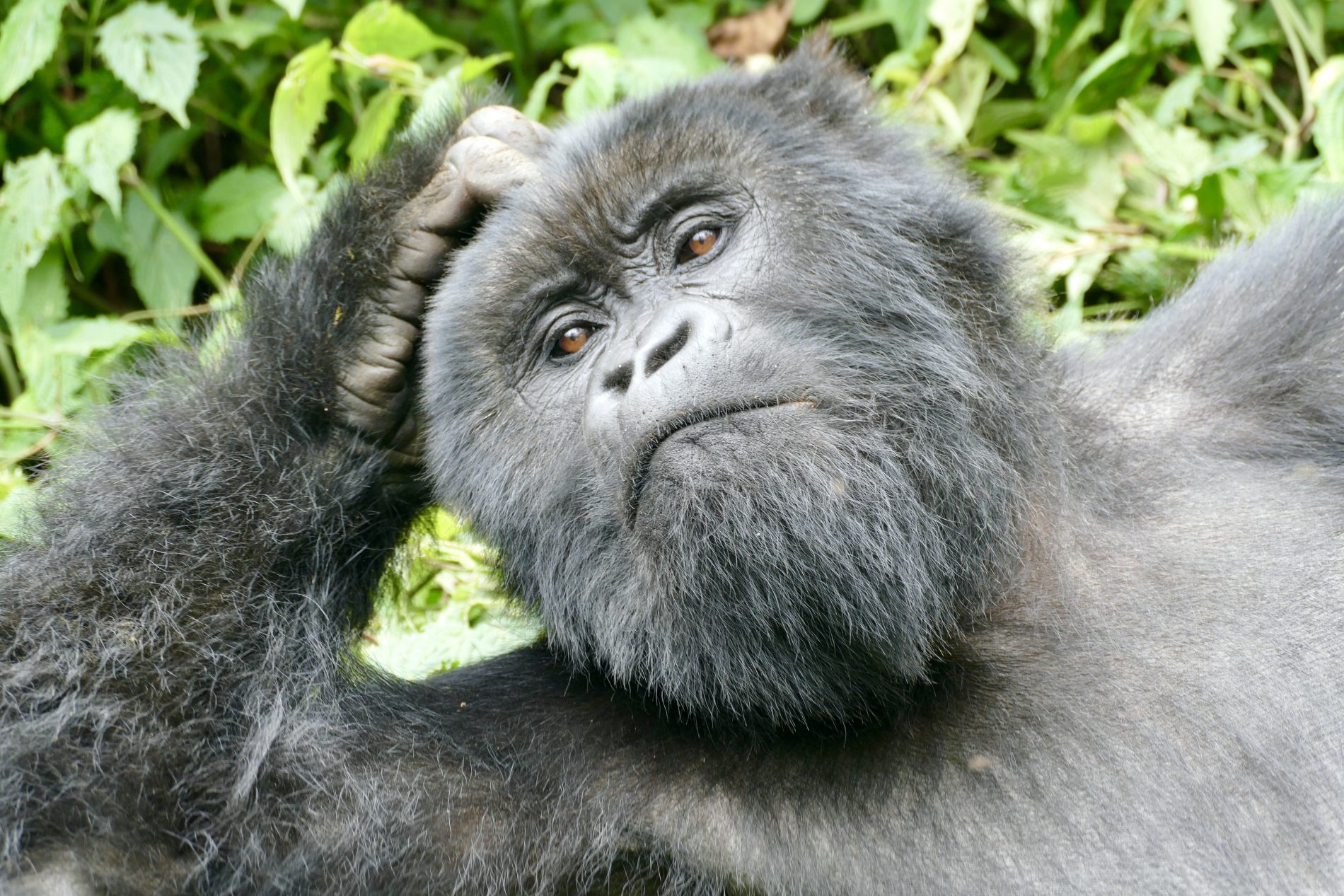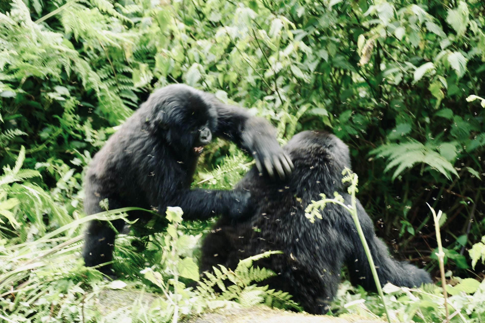 The hike was about 5km’s round trip through dense tropical jungle with only 70% on a trail and 30 hacked through brush with machetes. It took about 90 minutes to get to the gorillas. As soon as we neared them all protocols set in. Masks on, no bags and poles, that all remained behind with the porters who stayed back and waited for our return. Our guide and two trekkers took us in to meet the Kwitonda troop. Within 5 minutes we spotted the first gorilla and then spent 1 hour watch and following them. Exhilarating to see them interact, play, graze, groom and move from place to place. Finally, we got a silverback porn show. The chief silverback mated in front of us with one of the females, and at some point, one of the babies came to see what was going on.  During our encounter we kept our distance as best we could, but you do get close as they dash past or between us. The silverback you could touch when he walked past us and Wayne almost felt him as he moved – he was enormous. One of the babies ran past Simonne and touched her. Just before we left an adolescent gorilla ran between Glenn and a trekker who was 3 feet away from each other and grabbed Glenn’s leg on the way past – mistook it for a tree!!! Fortunately, Glenn was standing next to a tree as it almost knocked him over – he fell back into the tree and trekker put out a hand to stabilized Glenn.