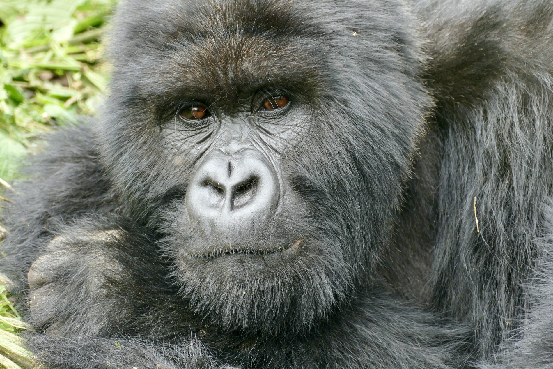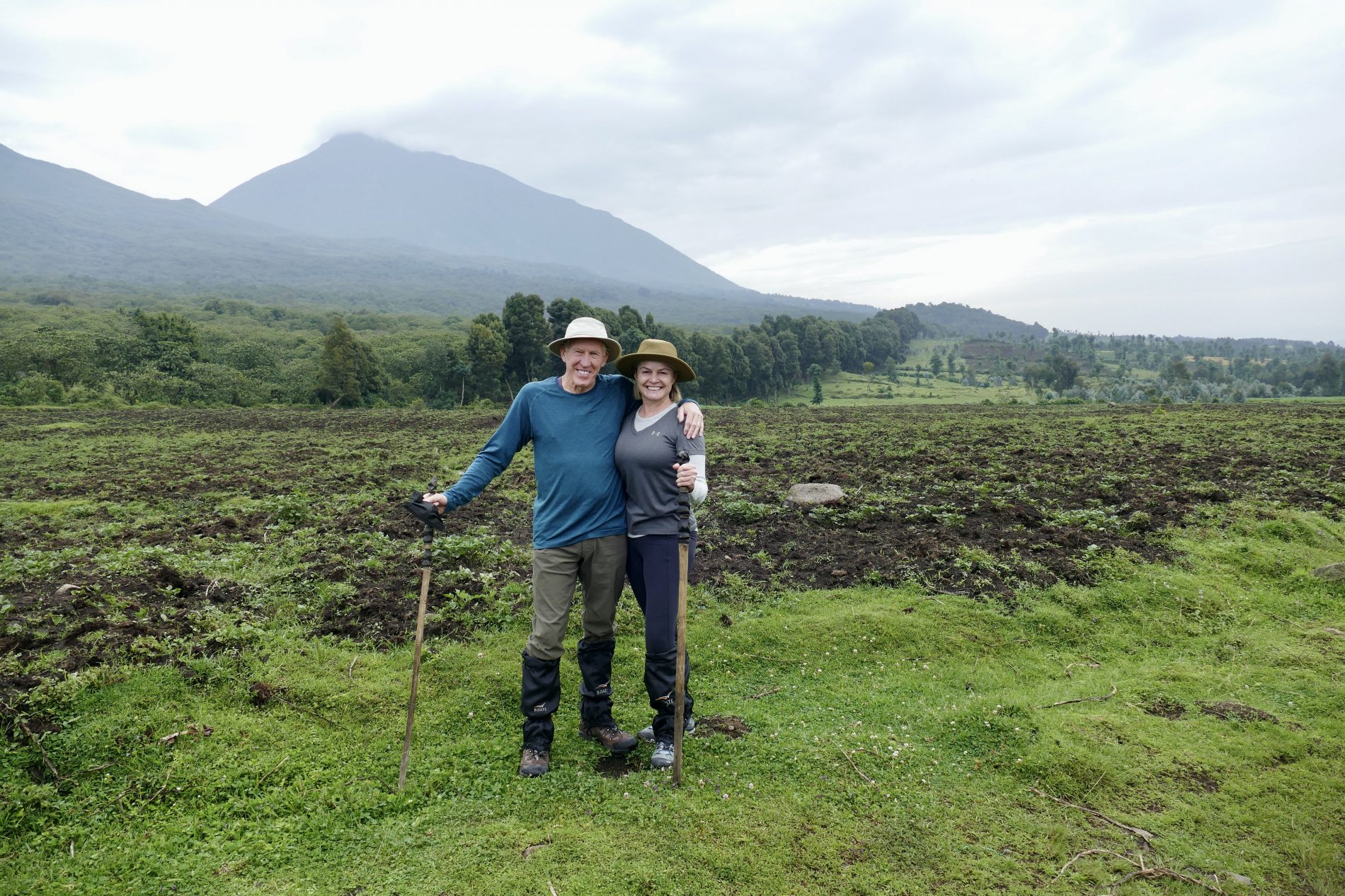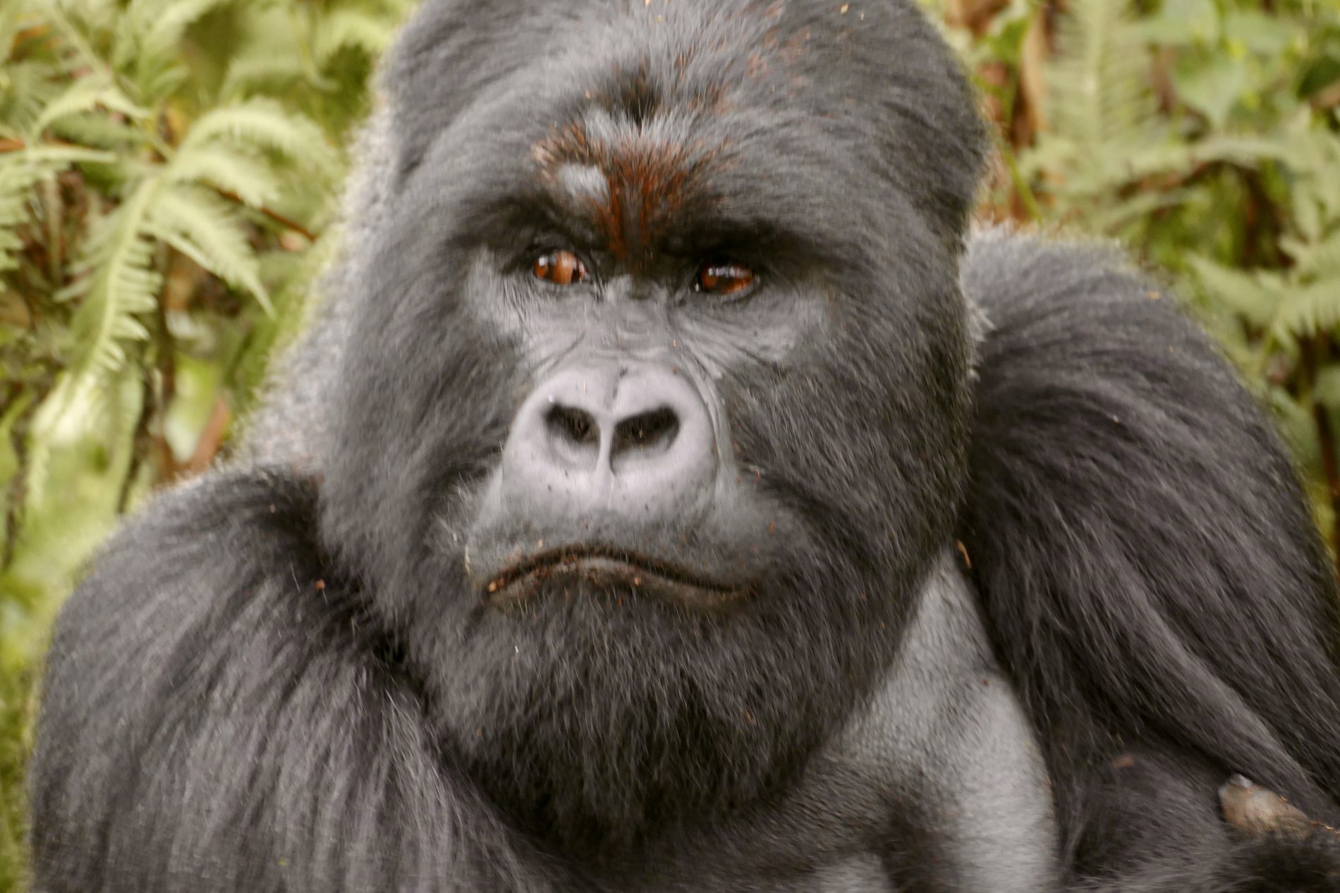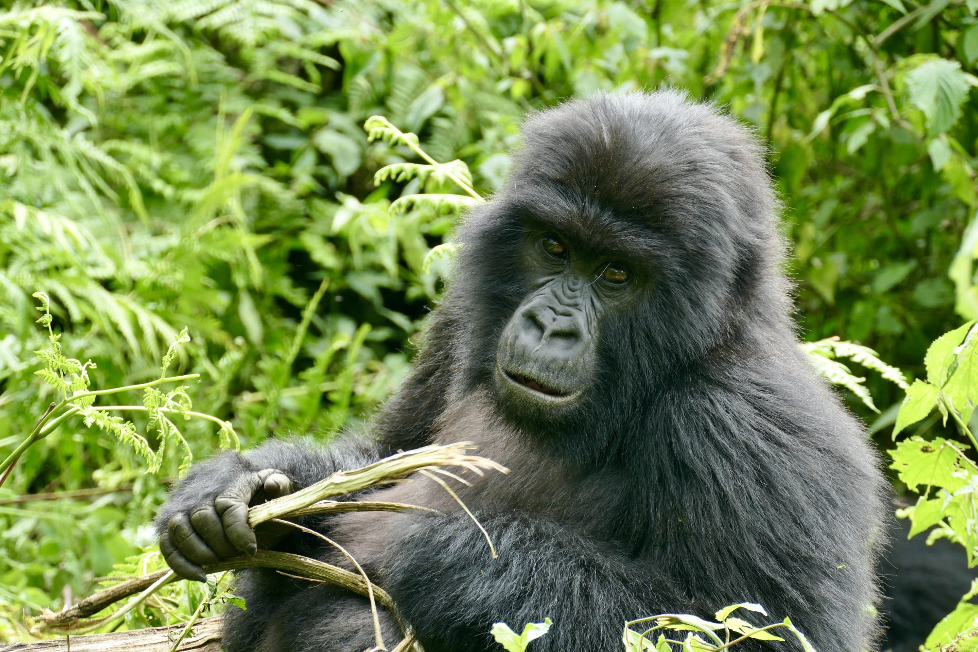The hike was about 5km’s round trip through dense tropical jungle with only 70% on a trail and 30 hacked through brush with machetes. It took about 90 minutes to get to the gorillas. As soon as we neared them all protocols set in. Masks on, no bags and poles, that all remained behind with the porters who stayed back and waited for our return. Our guide and two trekkers took us in to meet the Kwitonda troop. Within 5 minutes we spotted the first gorilla and then spent 1 hour watch and following them. Exhilarating to see them interact, play, graze, groom and move from place to place. Finally, we got a silverback porn show. The chief silverback mated in front of us with one of the females, and at some point, one of the babies came to see what was going on.  During our encounter we kept our distance as best we could, but you do get close as they dash past or between us. The silverback you could touch when he walked past us and Wayne almost felt him as he moved – he was enormous. One of the babies ran past Simonne and touched her. Just before we left an adolescent gorilla ran between Glenn and a trekker who was 3 feet away from each other and grabbed Glenn’s leg on the way past – mistook it for a tree!!! Fortunately, Glenn was standing next to a tree as it almost knocked him over – he fell back into the tree and trekker put out a hand to stabilized Glenn.