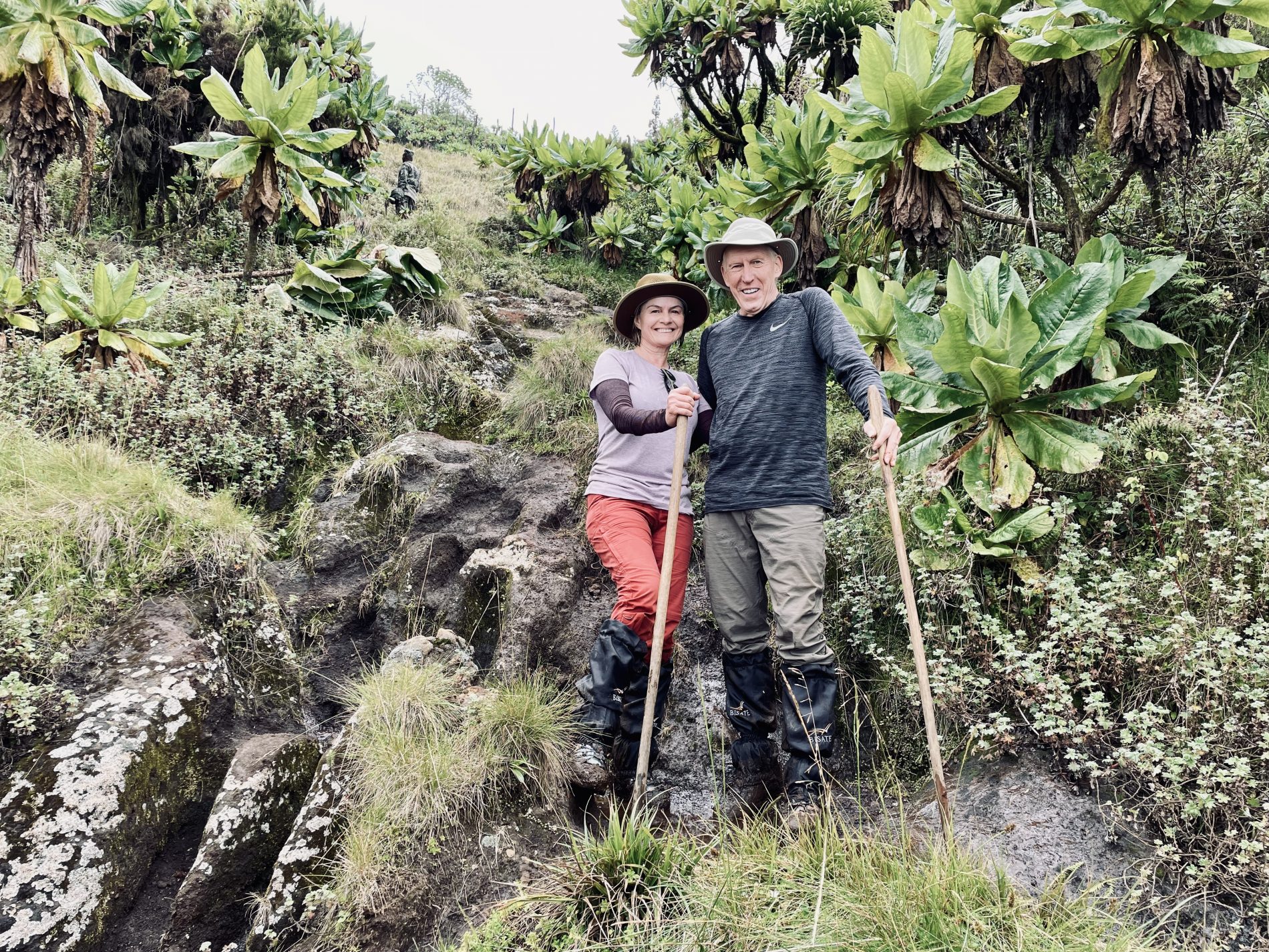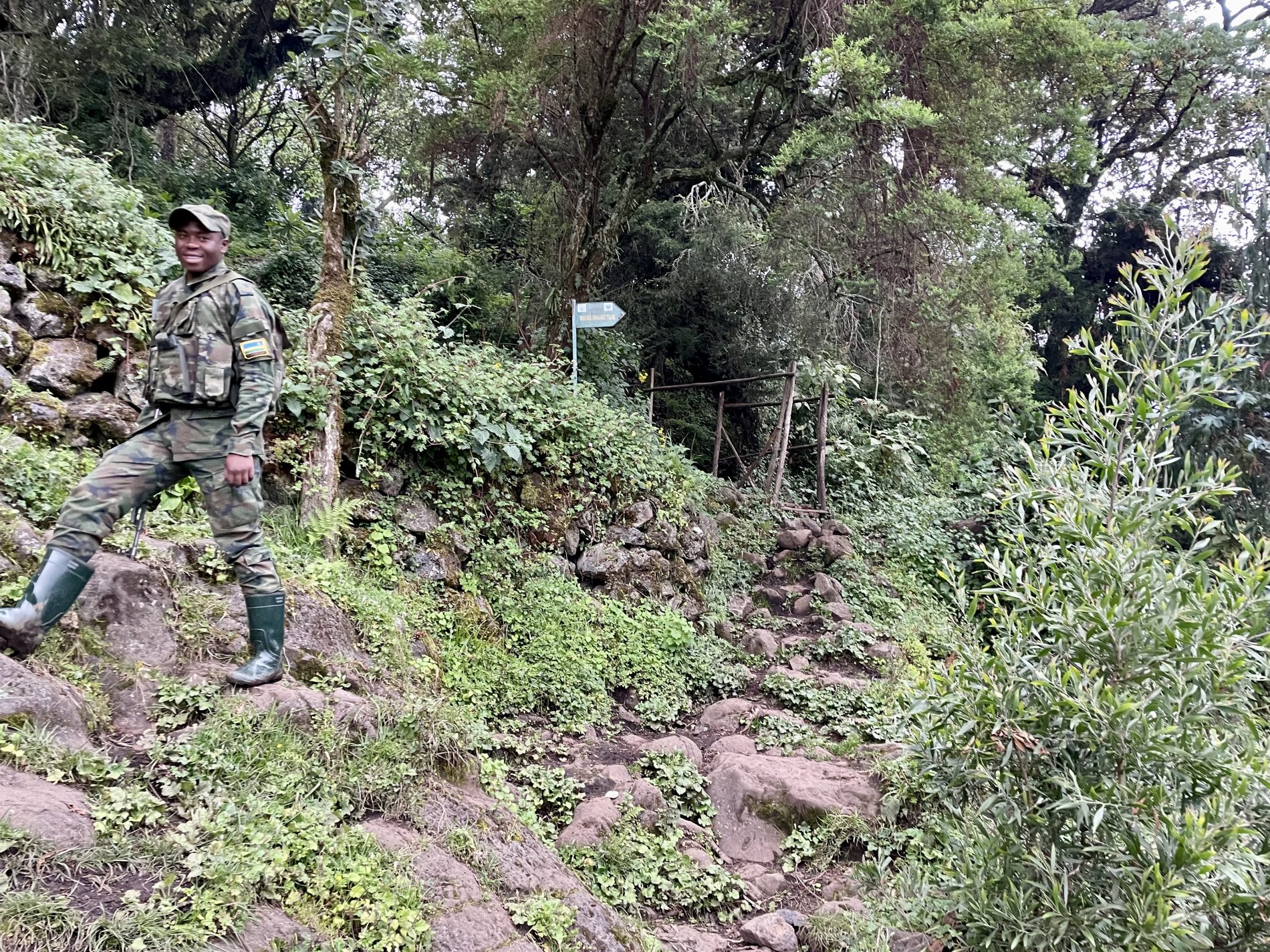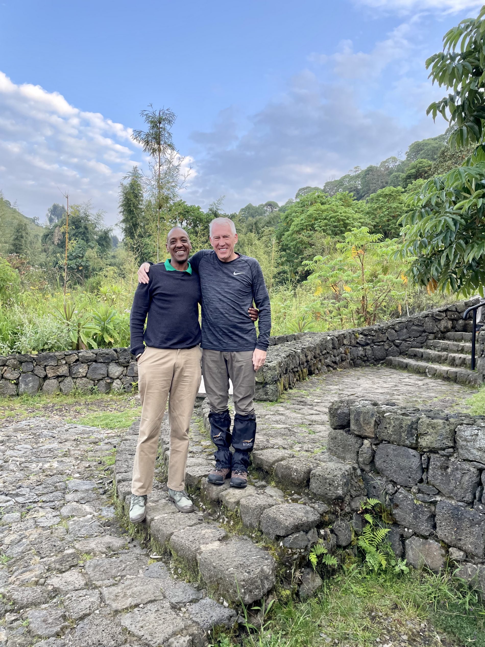 We got to breakfast at 6am for a quick coffee and a bite to eat (our regular routine) and to do final prep – staff helped put on our gaiters and we gathered fresh rain jackets and gloves. The laundry service is incredible here, even our boots are cleaned daily!!! Unfortunately, two of our party were not going to be joining us, Simonne was ill and Wayne had blown out his boot and was going to stay back with Simonne. Given this was a Covid test day they had to come along for the test as results were needed for the gorilla trek the next day, Jason picked them up and brought them back to the lodge, we continued on to our hike. Usual procedure took place – registration, cappuccino from the bistro and allocation of guides and groups with Roger representing us well. Emmanuel was our guide, and we would pick up porters at the start of the trail. The group was just Glenn and I, that should have told us something!!!