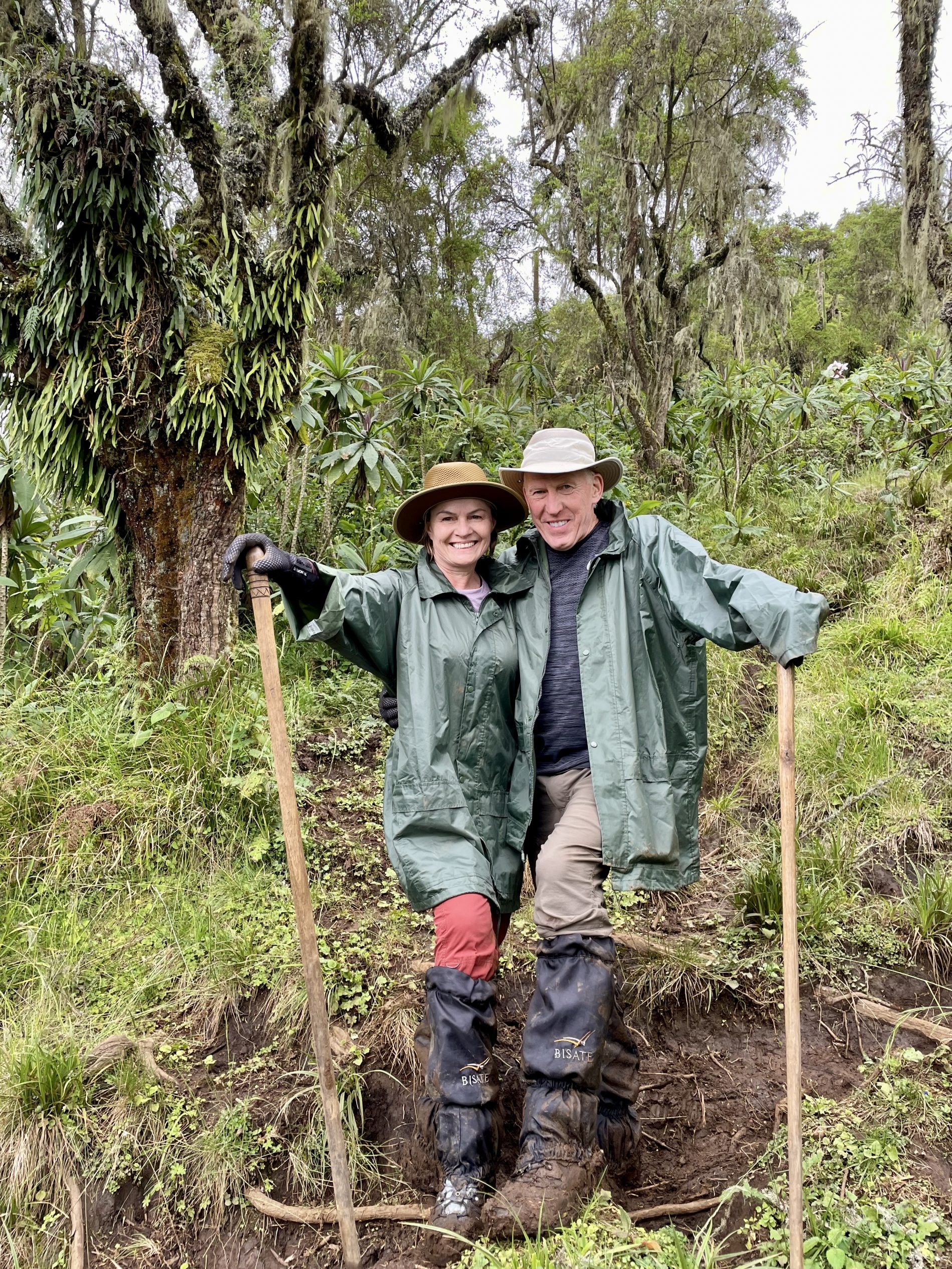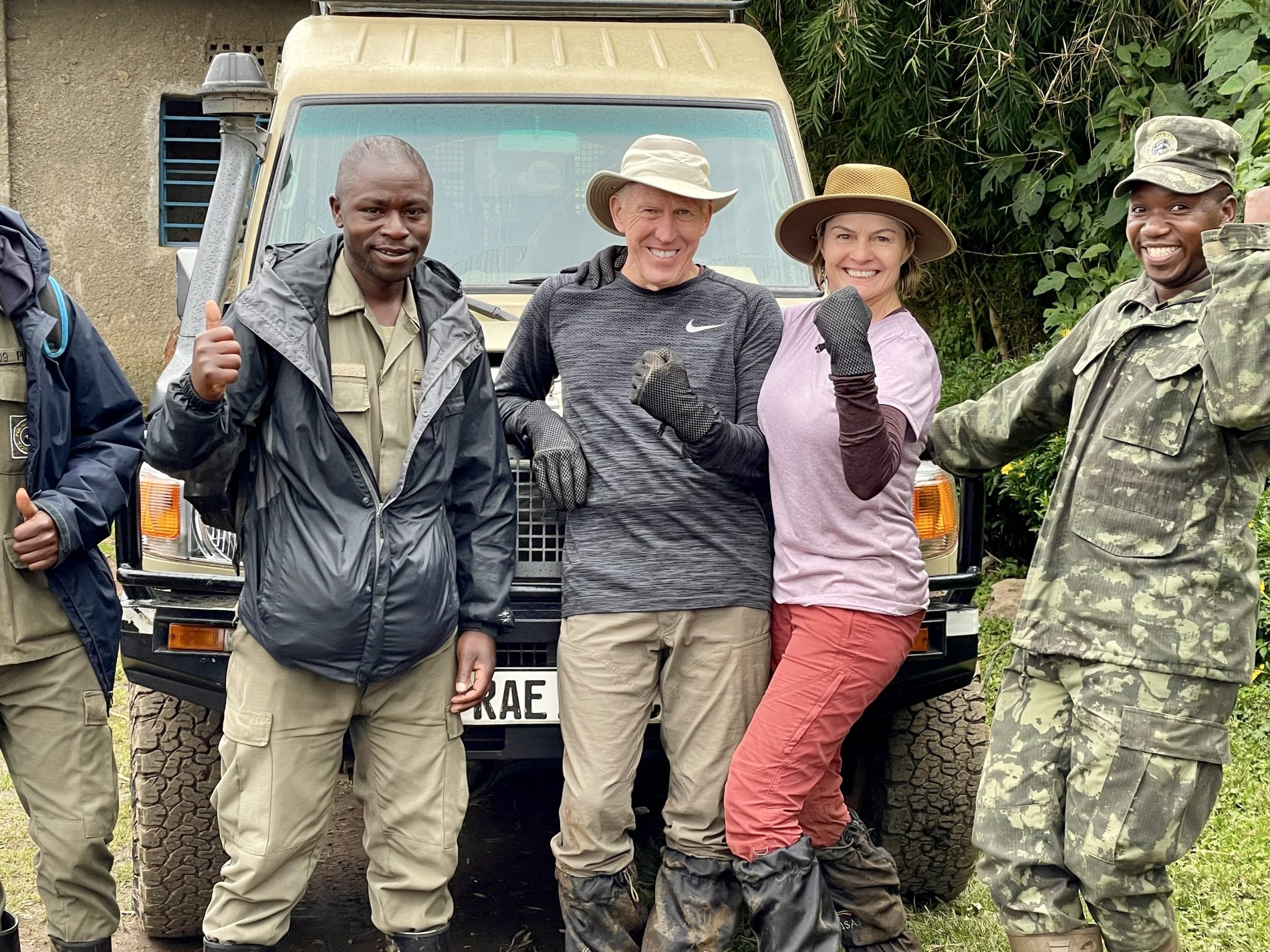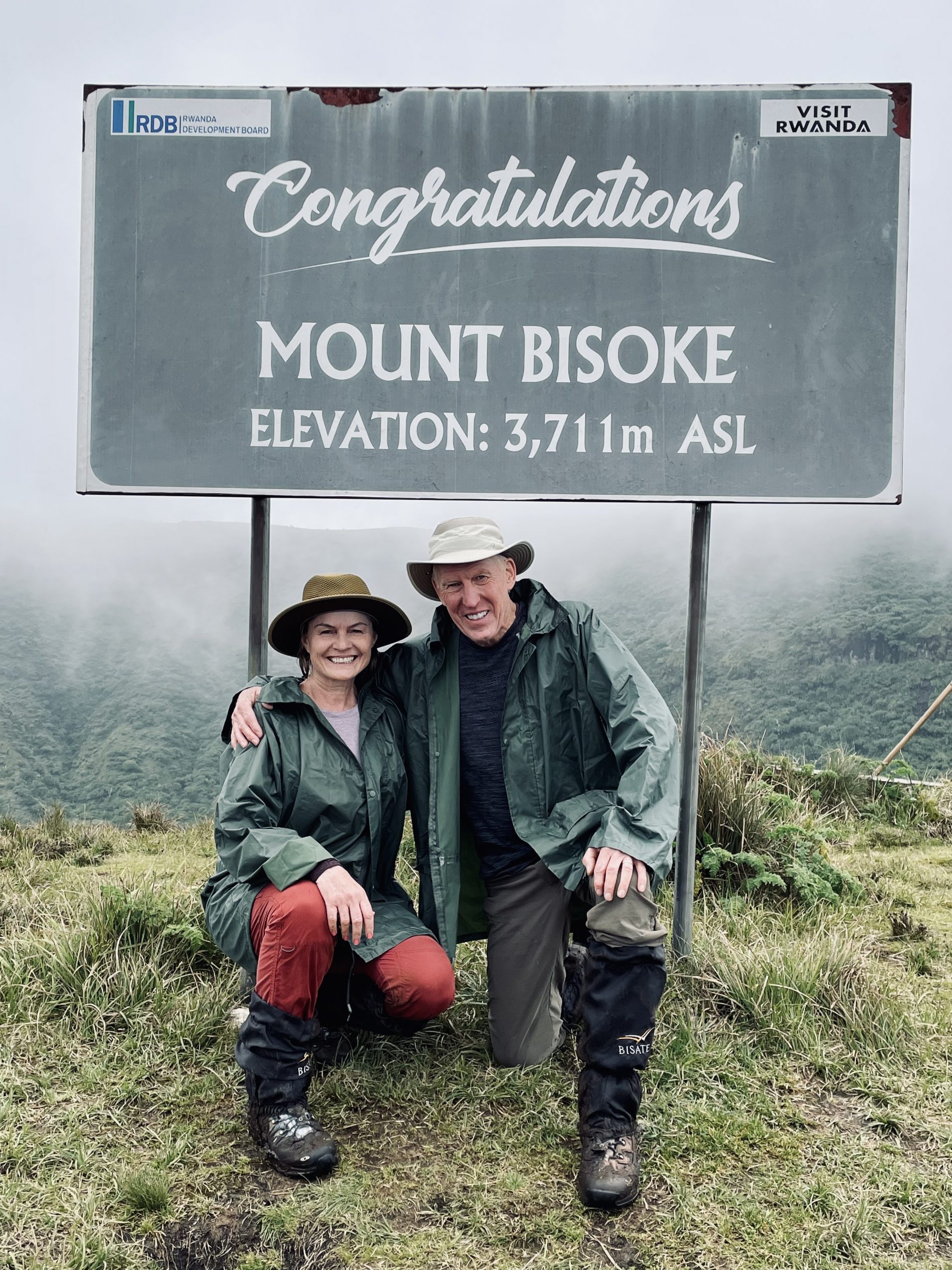 We set off on the hike up Mount Bisoke with two porters – Peter and Phocus. We were advised to do this and was our best decision ever. Well, as my friend Rich would say this was a “Christine death march”. We had expected it to be tough, but it was way beyond our expectations. We started heading up through the farmlands and then reached the wall of the park where we picked up 4 park rangers who joined us. They patrol for buffalo and keep the park safe. Emmanuel shared with us that the stone wall surrounding the park is 76km’s and stretches from Congo to Uganda and was built by the villagers. Once we entered the park, we continued our journey up the mountain through an African red wood forest until we reached an intersection where the trail spilt, and we got a short rest on some benches. Then it was off again up the mountain along a rocky and muddy path until we reached slightly lower vegetation and indigenous trees near the summit. About 1 hour from the top of the volcano I started to feel the effects of the altitude. Phocus was great, he encouraged me, and we took regular short breaks and sips of water to get me through. There was a moment where I wondered if I would make it… Glenn was a bit concerned as he could see I was struggling… but I made it, took all the courage I could muster. We reached the summit of Mount Bisoke, 3,711m above sea level. I was ecstatic – I had made it. The view was breathtaking, and we were lucky enough to see the crater lake. At last, a lunch break – much needed after that brutal climb. Then reality set in and we had to head down the slippery rocks, mud and treacherous terrain. This is when the porters were extremely useful as they put out a hand to steady you and guided you down and instruct you where to place your foot or to jump! On our descent we passed Sheryl Sandberg and her entourage – what a surprise!!! The descent was at quite a pace, we only stopped again at the benches for a brief rest before continuing. Evidence of the mud – look at Glenn’s boots. There was the threat of rain and Emmanuel wanted us to make it down before the rain which fortunately never came. We were only too grateful that it did not rain as that would have made the descent unbearable!!! I fared better on the descent than Glenn, been a long time since I pushed my quads that much. When we finally made it back to the 4×4 we were shattered.