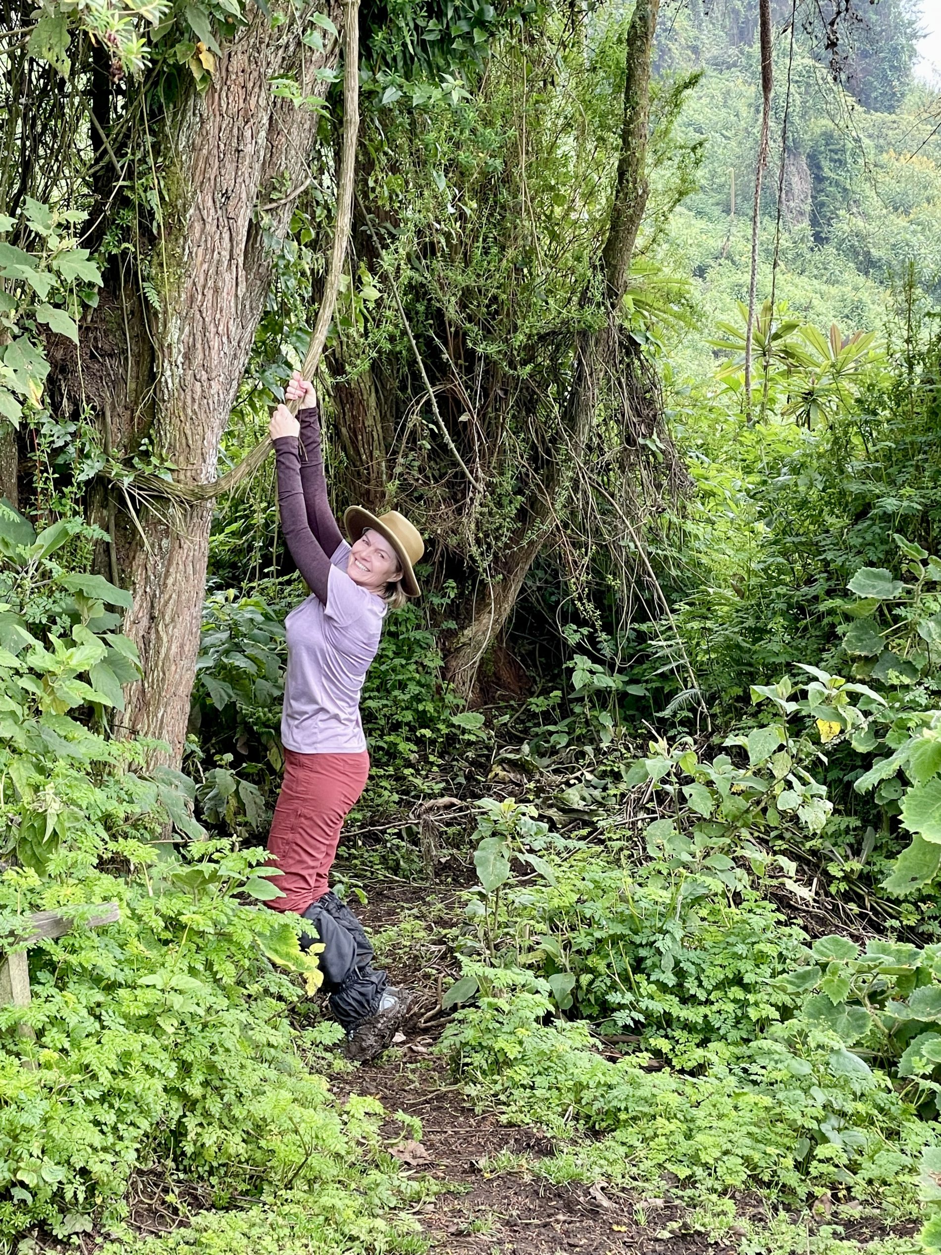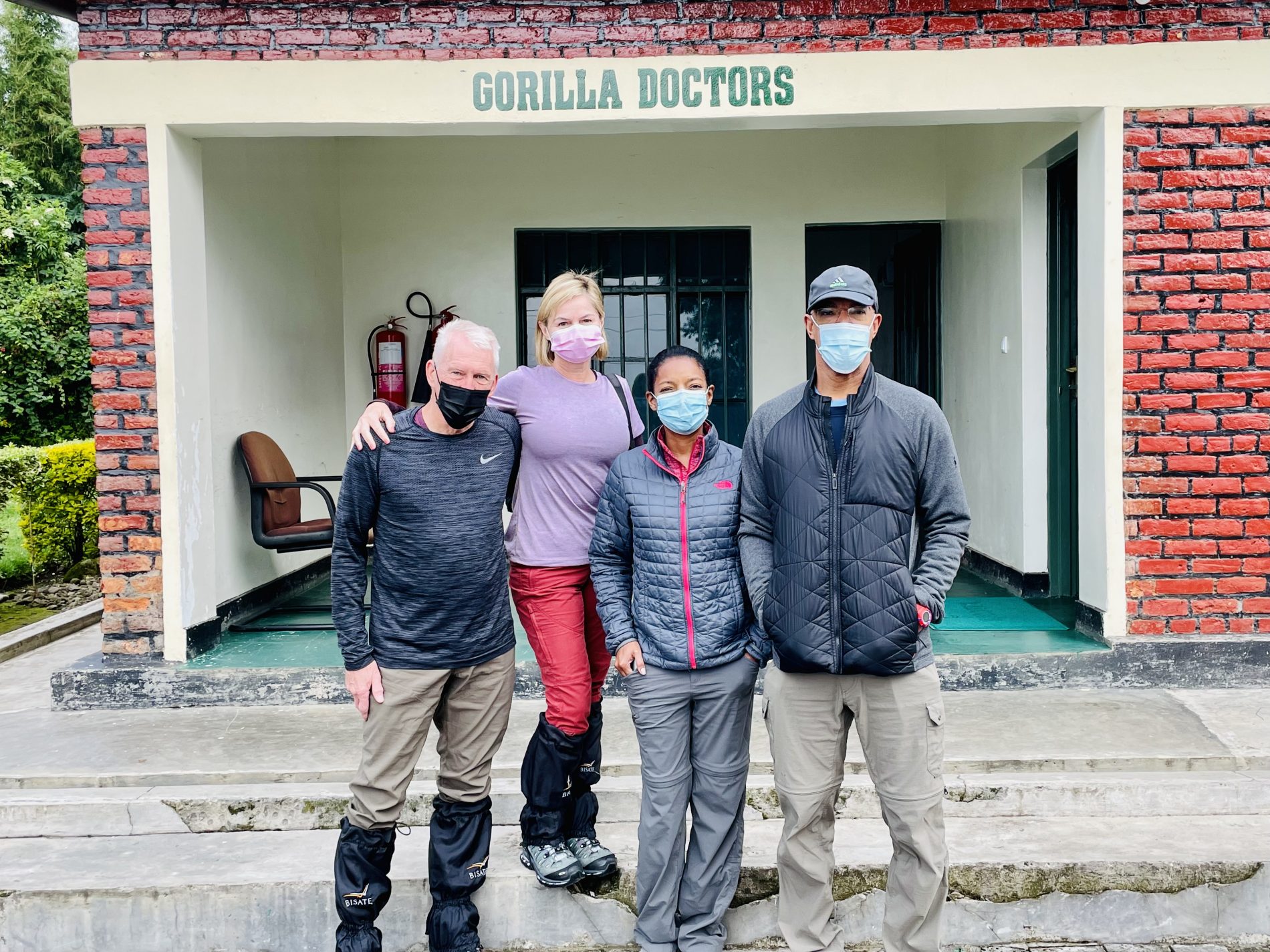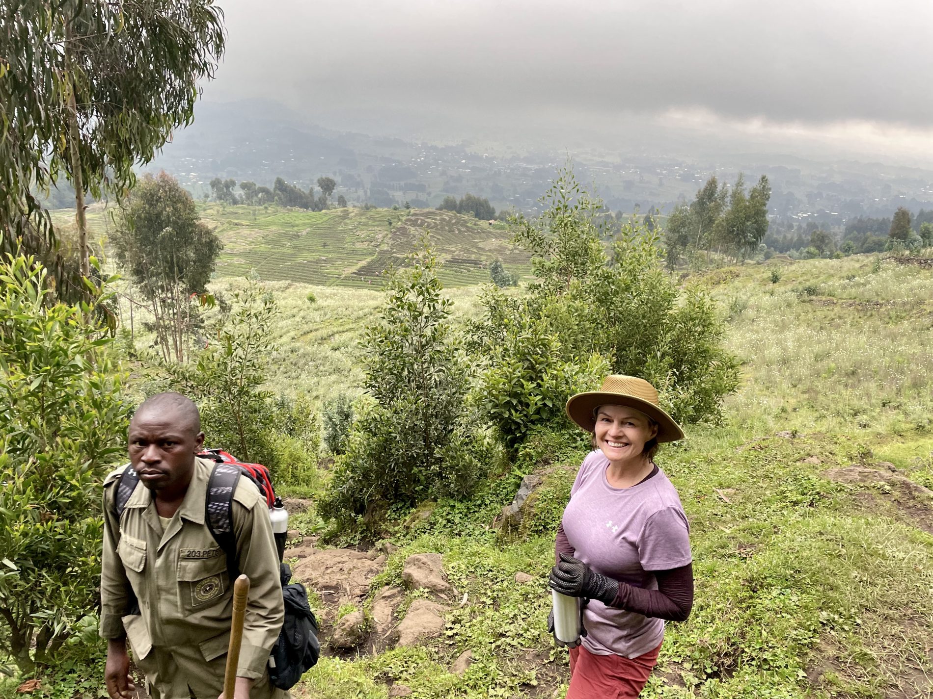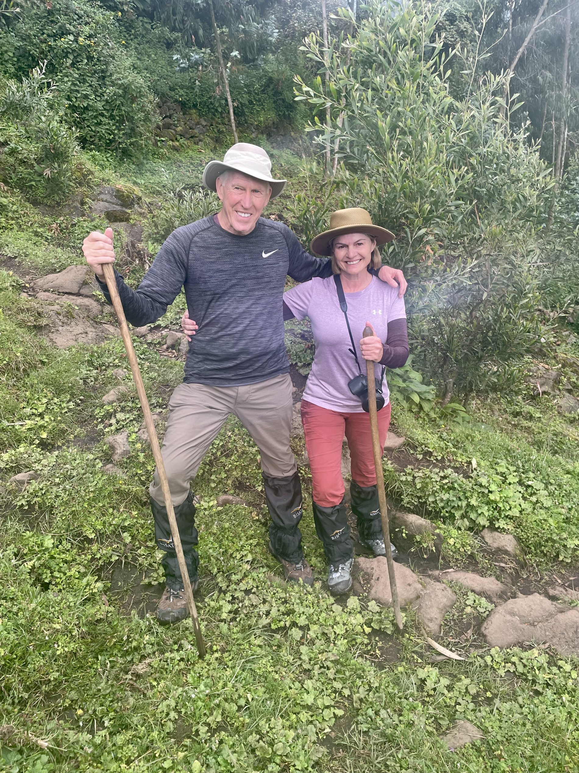 We set off on the hike up Mount Bisoke with two porters – Peter and Phocus. We were advised to do this and was our best decision ever. Well, as my friend Rich would say this was a “Christine death march”. We had expected it to be tough, but it was way beyond our expectations. We started heading up through the farmlands and then reached the wall of the park where we picked up 4 park rangers who joined us. They patrol for buffalo and keep the park safe. Emmanuel shared with us that the stone wall surrounding the park is 76km’s and stretches from Congo to Uganda and was built by the villagers. Once we entered the park, we continued our journey up the mountain through an African red wood forest until we reached an intersection where the trail spilt, and we got a short rest on some benches. Then it was off again up the mountain along a rocky and muddy path until we reached slightly lower vegetation and indigenous trees near the summit. About 1 hour from the top of the volcano I started to feel the effects of the altitude. Phocus was great, he encouraged me, and we took regular short breaks and sips of water to get me through. There was a moment where I wondered if I would make it… Glenn was a bit concerned as he could see I was struggling… but I made it, took all the courage I could muster. We reached the summit of Mount Bisoke, 3,711m above sea level. I was ecstatic – I had made it. The view was breathtaking, and we were lucky enough to see the crater lake. At last, a lunch break – much needed after that brutal climb. Then reality set in and we had to head down the slippery rocks, mud and treacherous terrain. This is when the porters were extremely useful as they put out a hand to steady you and guided you down and instruct you where to place your foot or to jump! On our descent we passed Sheryl Sandberg and her entourage – what a surprise!!! The descent was at quite a pace, we only stopped again at the benches for a brief rest before continuing. Evidence of the mud – look at Glenn’s boots. There was the threat of rain and Emmanuel wanted us to make it down before the rain which fortunately never came. We were only too grateful that it did not rain as that would have made the descent unbearable!!! I fared better on the descent than Glenn, been a long time since I pushed my quads that much. When we finally made it back to the 4×4 we were shattered.