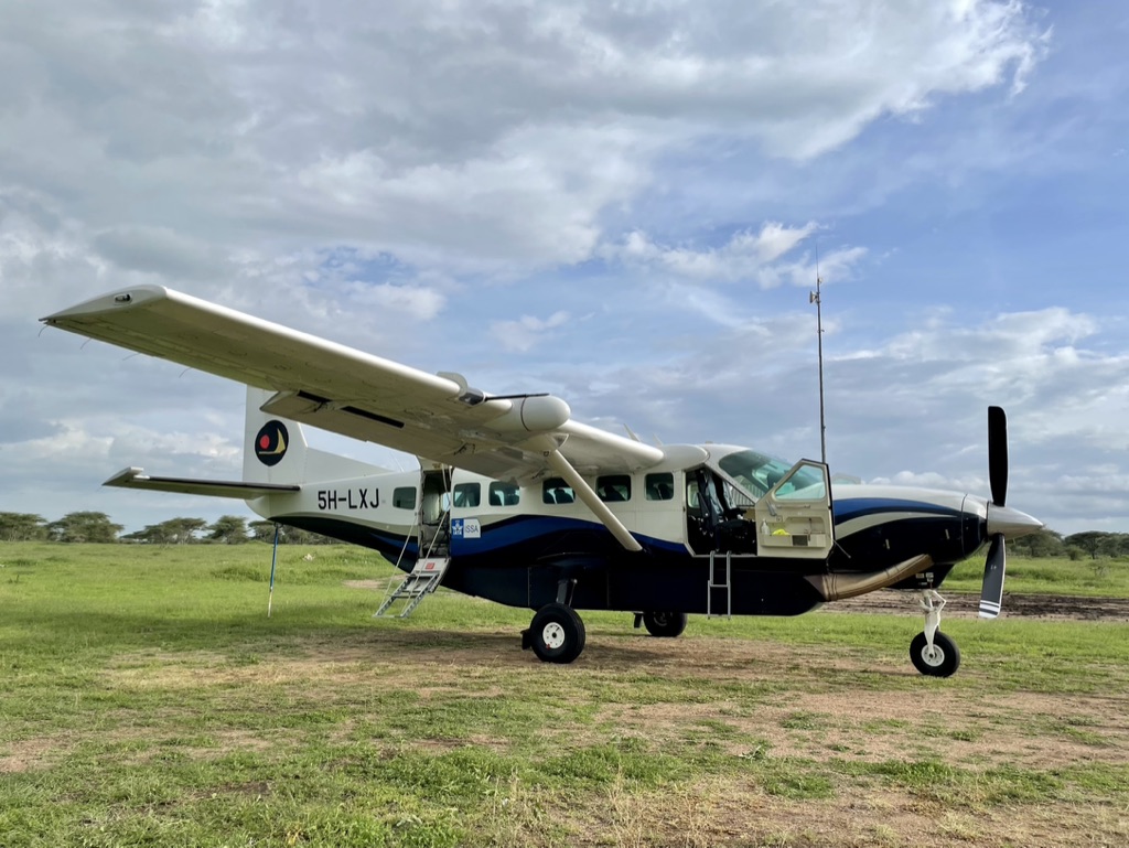 A full day of travel. We are heading to the Serengeti. Arrived at the airport and no international flights landing or departing, it was desolate. We were on a charter flight to Ndutu and turns out we were the only 4 passengers. Lots of waiting around – fortunately there was a great gift shop with local arts and crafts and a coffee shop. At about 1pm we headed to the boarding gate. Funny story, we were escorted to a bus and Simonne was rearranging her bag. Glenn and I and our luggage were on, the bus took off. Fortunately, we noticed Wayne and Simonne had been left behind and alerted the driver. He stopped and we discovered they were not allowed through the doors – our escort sorted it out and we all headed for the 12-seater Cessna Caravan.