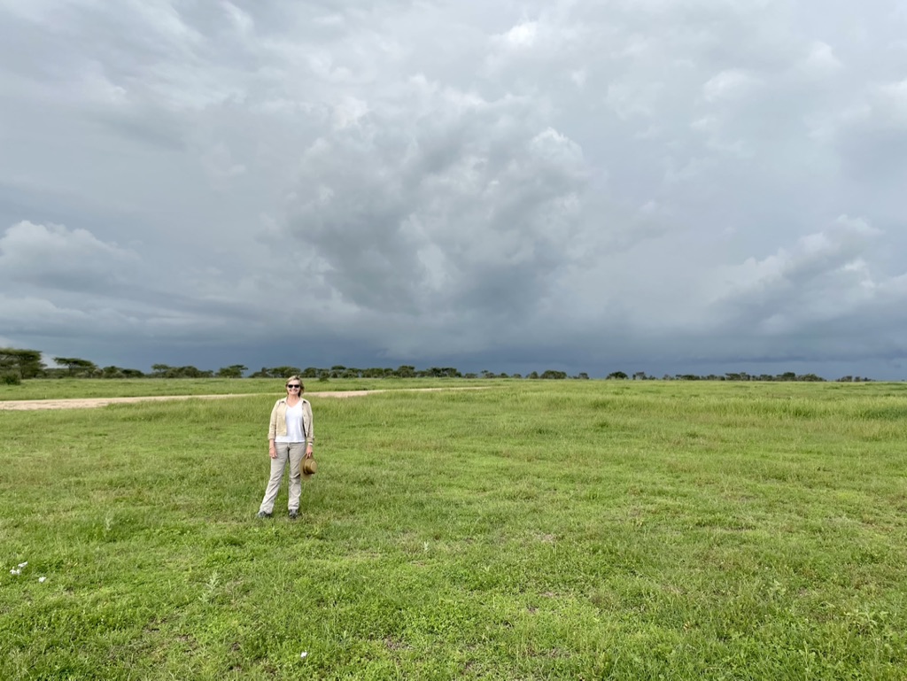 Back on the plane we headed to Ndutu airstrip. It was a short flight and we spotted animals – herds of zebra and wildebeest, giraffe, and the a couple of lions. Getting excited. That was short lived, as we started our descent a thunderstorm came in and we flew right into it. The result, an aborted landing and off to another airstrip – Kusini airstrip. Lots of discussion and radioing. After about 20 minutes we were back on the plane. The pilot shared they believe it is clearing and the storm is moving our direction so they would make a second attempt to land. If that did not work, we were off to Arusha. Fortunately, we had a successful landing.