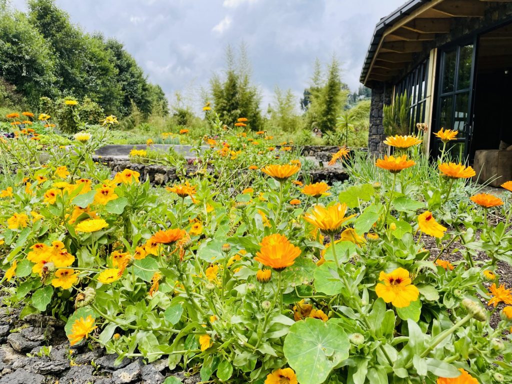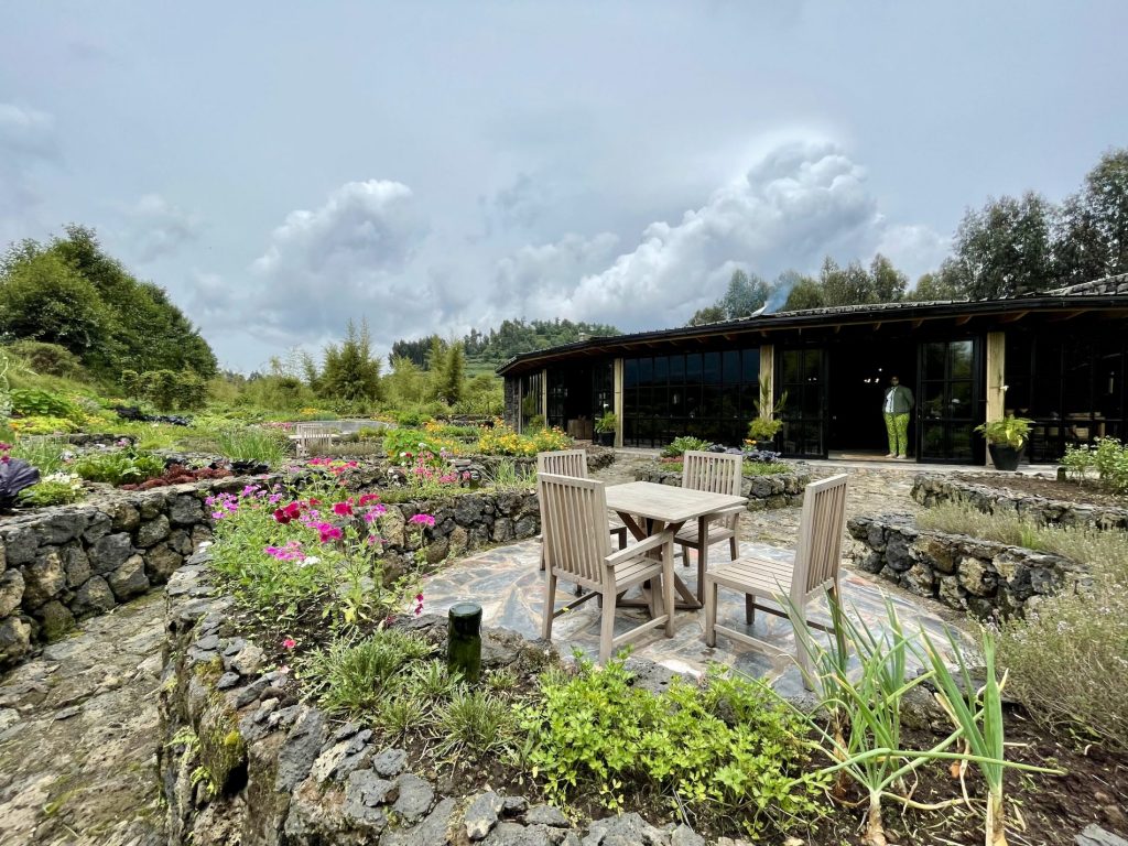Glenn is owning that chair and enjoying the environment… Food is sensational with many vegetarian options, fresh ingredients and salads. Photos tell it all… We took the opportunity to explore the property. Benjamin took us to the nursery where they are working on reforestation and irradicating the eucalyptus which is not indigenous to Rwanda. Then we walked through the onsite kitchen garden at Bisate Kwanda – this includes a day lounge, restaurant area and gift shop. Saw the tomato tree fruit and discovered a clever use of empty wine bottles – may have to adopt that for my garden! Glenn got an education on climbing beans and has 3 seeds for us to plant in LA. Lastly, I captured a couple of cool shots of our lodge…