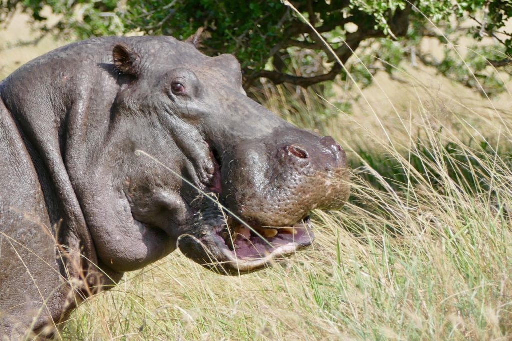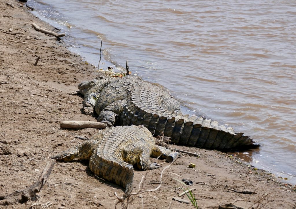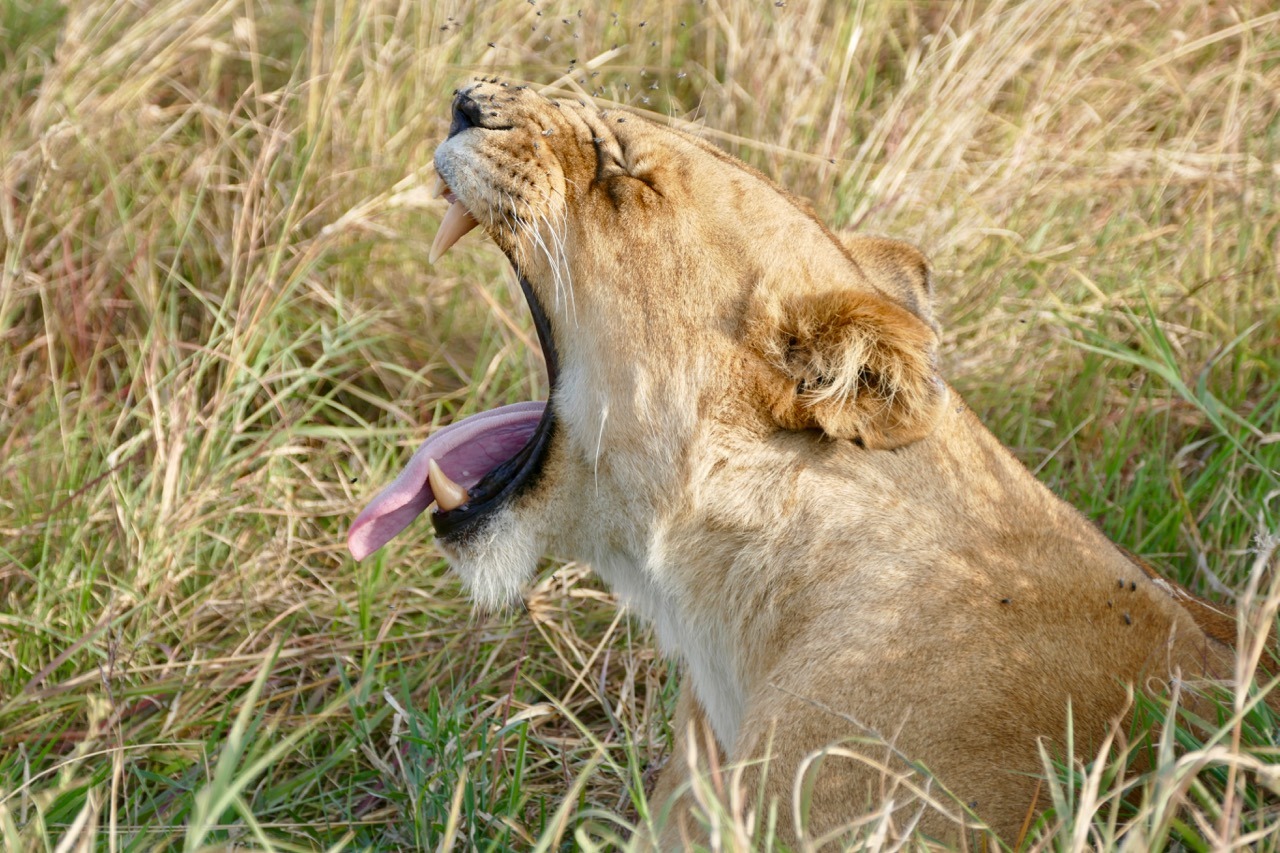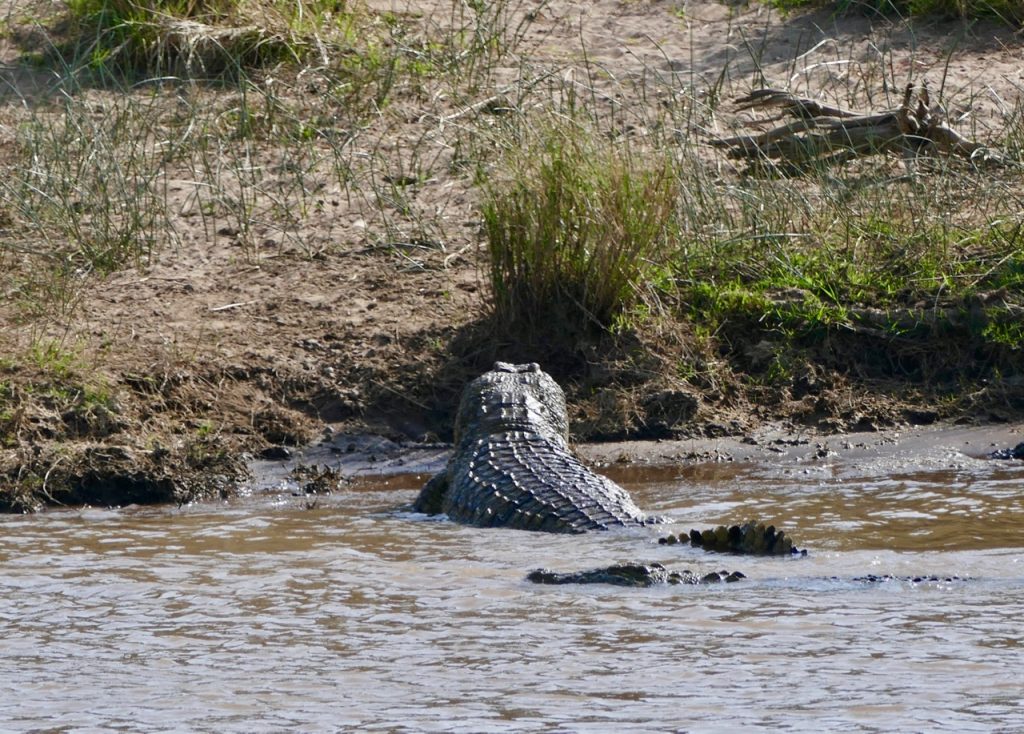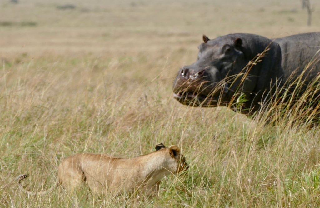 We were off on a balloon safari which is why the early start, what a cool experience, highly recommended! We saw the Masai Mara from a completely different perspective, looking at the plains and escarpment from the air was exhilarating, felt a bit like I was in a movie and floating, not reality. The game were active – I learnt that the grass is actually patterned, it has animal tracks all through it, something I never realized (or saw) viewing game from a safari vehicle! Our trip ended with a rough ride to a champagne breakfast. On the way we ran into a pride of lions – 2 lionesses and 3 cubs. Andbeyond picked us up after breakfast and we joined our safari companions on a game drive. We decided to go looking for the lions we saw earlier, lucky us, our guide found the pride of 5, they had moved and were active and on the move. We followed them for some time, watching them walk, play, stop, look around in search of an entree. Eventually we had an awesome exclusive sighting. All other vehicles had left and we had the pride to ourselves. The lions seemed to be thirsty and went in search of water. As they approached a small pond, a hippo emerged and chased them off. The young cubs pretended to hunt the hippo and we watched as they chased each other around for a bit. Eventually the hippo wandered off grazing and the lions went in search of that entree. The adult lions found a lookout mound, they perked on top searching the horizon, nothing to be found. After some time, they decided to conserve energy and headed for shade and sleep. We went in search of a crossing at the Mara River – saw the most enormous crocodiles and multiple hippo pods. The hippos were in and out of the water and it was incredible to watch. Never seen so many, still quite large, ugly and generally inactive but managed to capture a yawn!!! Also captured some beautiful shots of the Topi (antelope) and Grey Crown Crane. It was a long morning and only got back to our lodge at 2:00pm. Lunch was fresh and light and just what we needed before some rest. Unanimous decision, cut our afternoon drive short and start later.