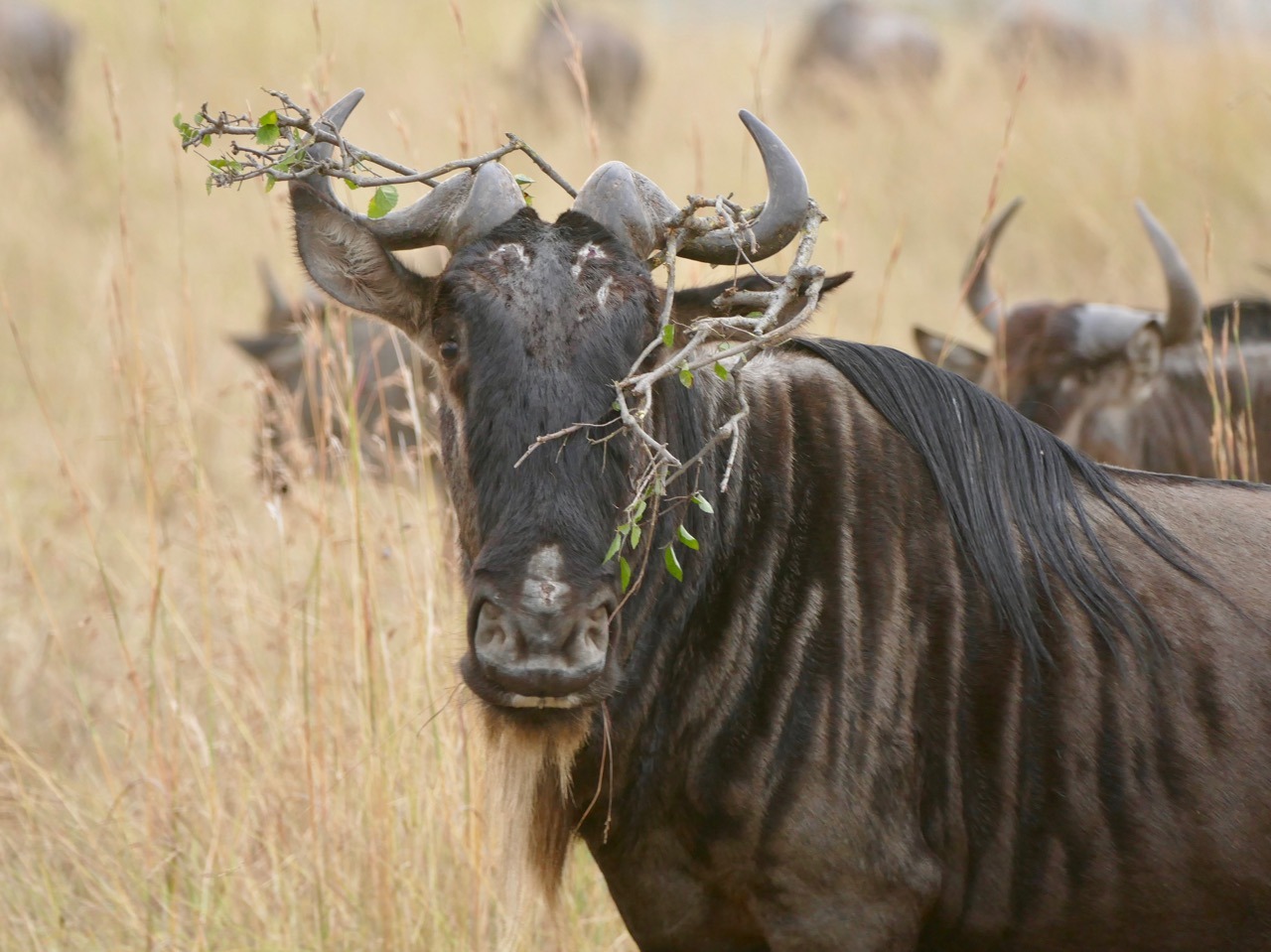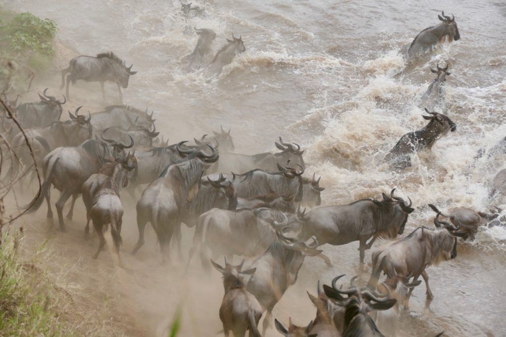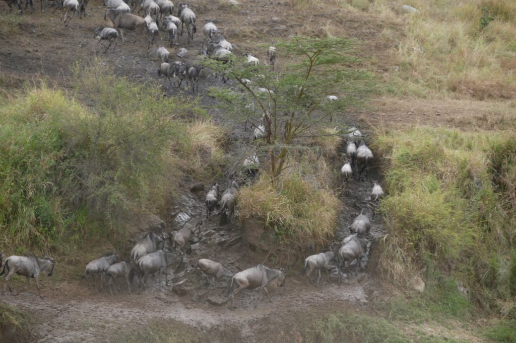 Kogatenda “airport” was a couple parked 4X4’s, a wooden fence, dirt airstrip and a windsock. We were welcomed by Serengeti under canvas staff who were ready to serve us coffee and tea, we wanted none of that, instead proposed to drive to the crossing sight to see if we can still catch it… Our guide obliged, and we were off racing through the bush as fast as one can go without any injuries. Of course, there were a couple of stops due to the abundant animal life and the avid photographer, moi. We got to Mara River crossing number 4 and thousands of wildebeest were milling around agitated and nervous, pushing, shoving, snorting, communicating and then heading down to the river. They ran as they get closer to the river, jumping off high banks, splashing, running, and swimming when needed, across the river. Then up the other side, if they make it across without being dinner for a croc and start milling around again, still quite agitated. Some headed off to fresh grass while a couple of hundred more confused wildebeest turned around and headed back across the river. A dream come true to witness this – one of the natural wonders of the world.