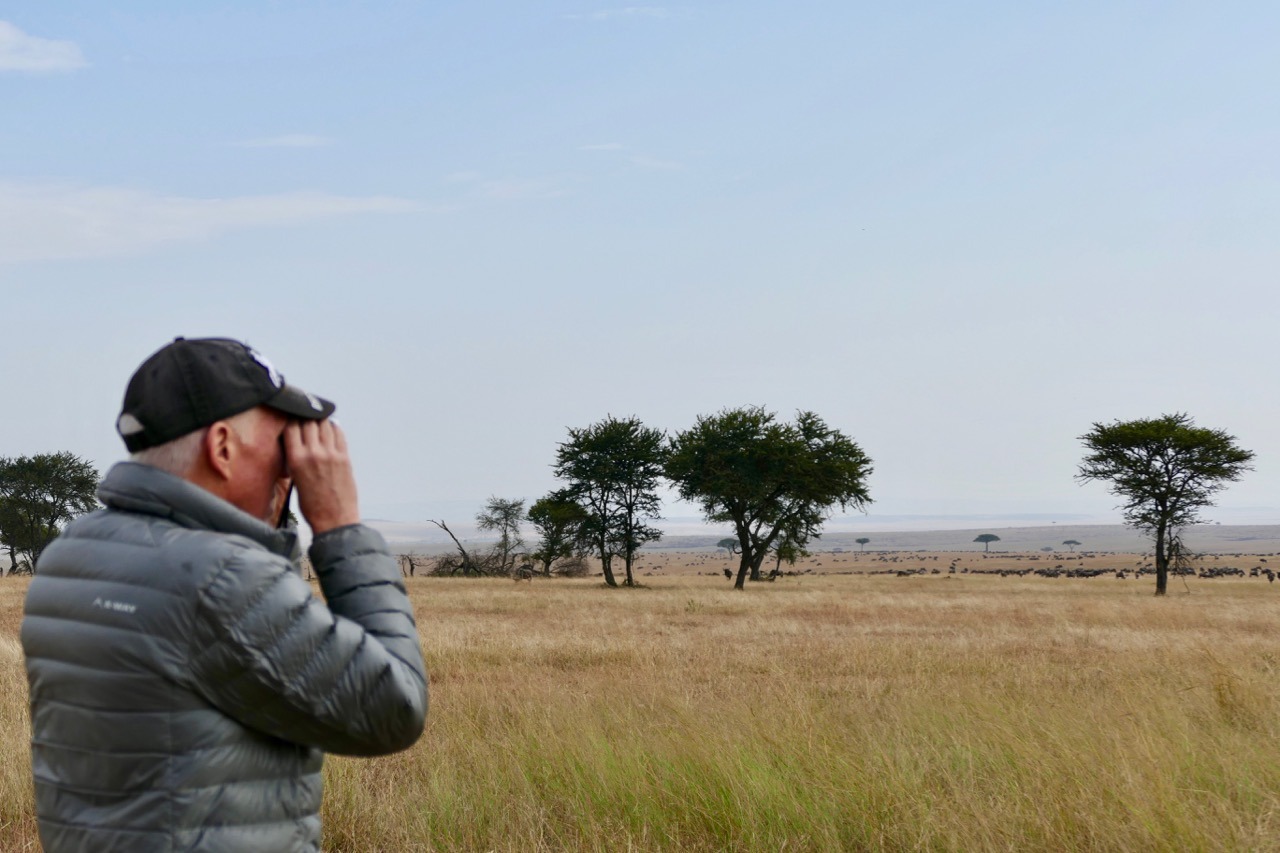 Time for some exercise, did a hike up the Oloololo escarpment before breakfast, then the start of our onward journey. Magnificent view of the Masai Mara and the animal activity. Saw a fresh giraffe carcass with about 20 vultures at it, am sure the lions or hyenas would arrive later in the day! Had to say goodbye to Bateleur Camp and head for Tanzania. The giraffes were out to say goodbye too…