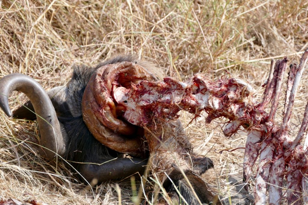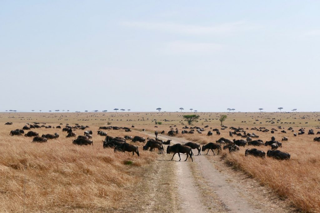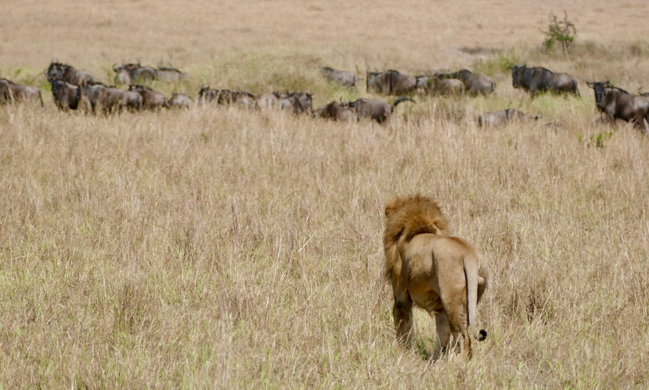 We stopped for breakfast in the bush and were spoilt with homemade granola, papaya, muffins, boiled eggs and Kenyan coffee – delicious. Our view was hundreds of wildebeest across the savannah. We set off again and encountered more lions (this time sleeping), vultures – one had eaten so much he just sat perked on a stump too full to fly, carcasses, and then a male lion stalking a herd of wildebeest, an unsuccessful kill but awesome to watch. Still holding out for a kill. Lots of birdlife, two great moments: