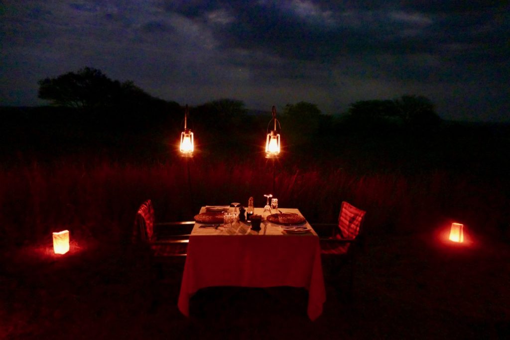 Headed back to camp after about 6 hours out. Time for lunch, as you can see from my photos we were spoilt – the perfect setting with the Serengeti as our backdrop, china and crystal table setting, and fresh beautiful food. Decided a glass or two of sauvignon blanc was required! Before our game drive, Edward prepared our hot bucket shower – good feeling to be clean again, the bush is pretty dusty – the saying goes “bush makeup”. For the afternoon game drive, we went in search of another crossing but no luck, saw lots of animal activity and enjoyed appreciating the “circle of life”. On our journey back to camp we stopped for sundowners in the bush, gin and tonics all round. Seemed appropriate. Back at camp Glenn had planned a romantic dinner for two at our tent, a great end to two days of “camping”. Wait there is more…
